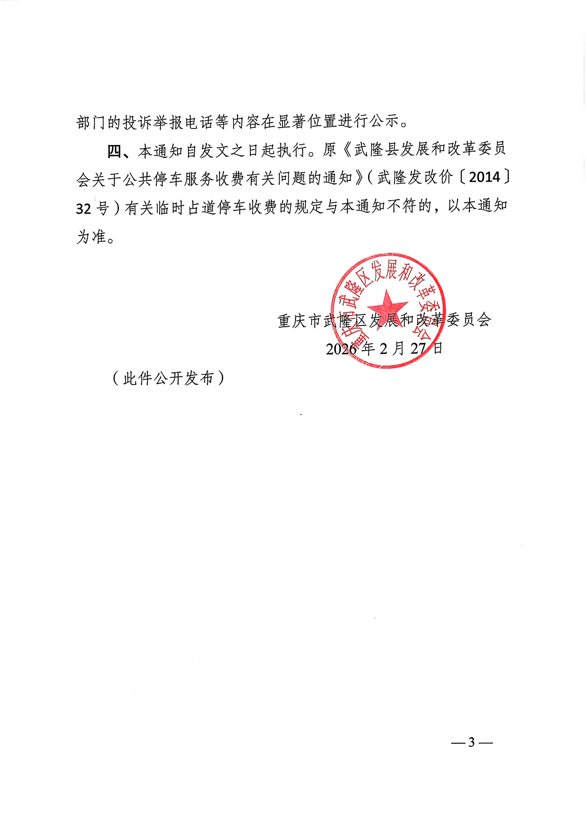 重庆市武隆区发展和改革委员会关于调整机动车路内停放服务收费标准的通知