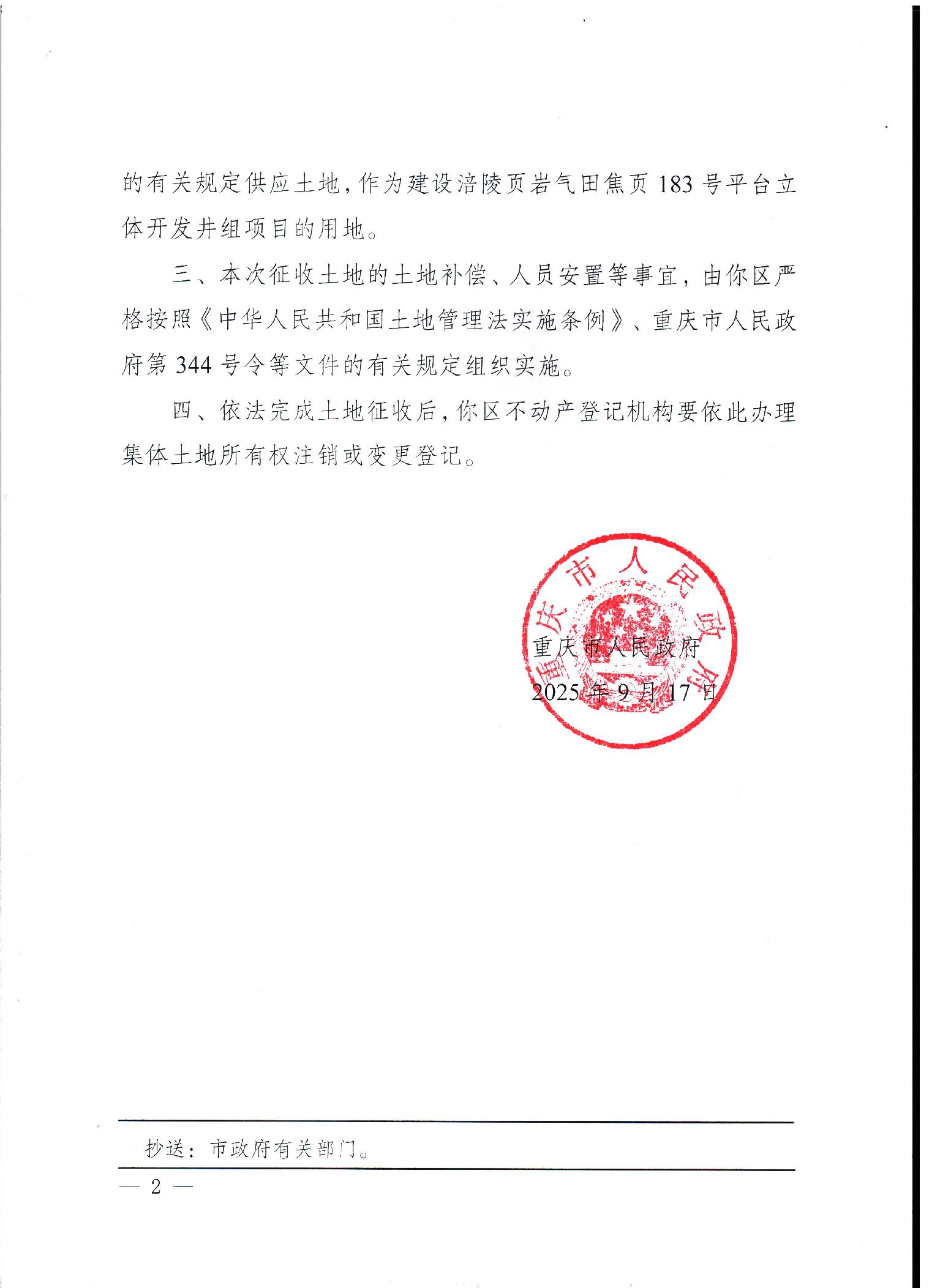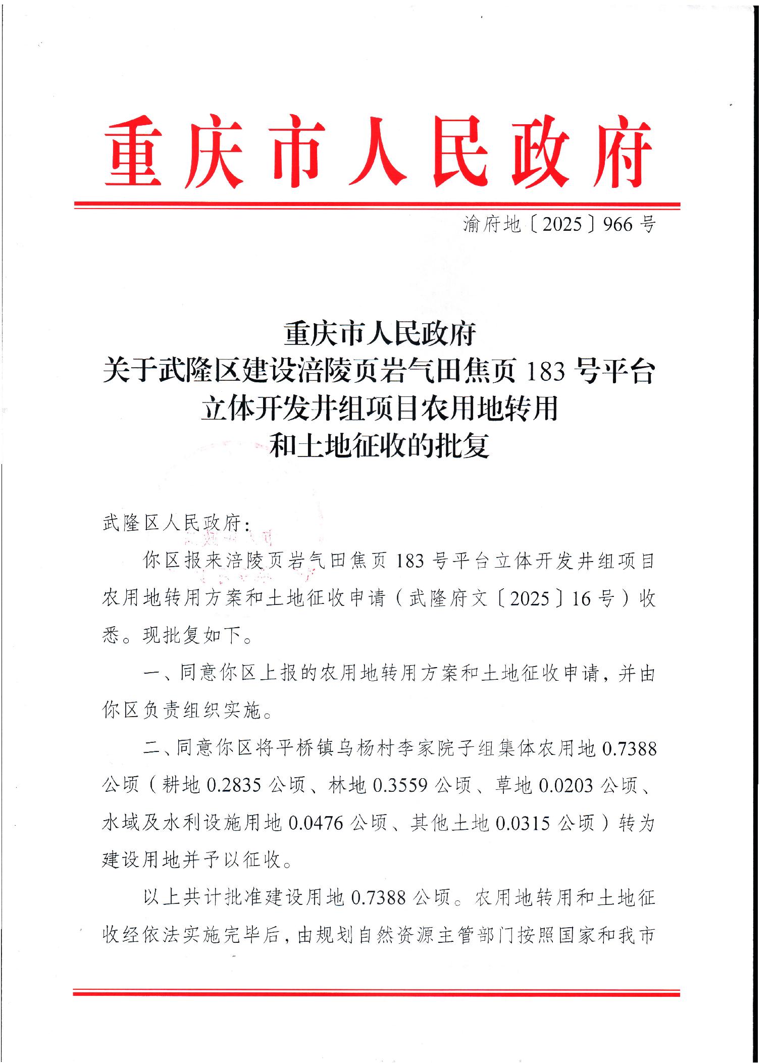 重庆市人民政府关于武隆区建设涪陵页岩气田焦页183号平台立体开发井组项目农用地转用和土地征收的批复