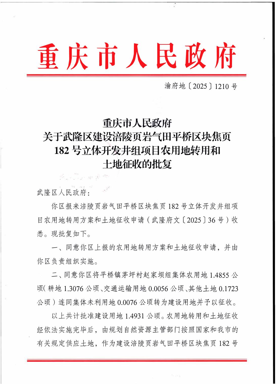 重庆市人民政府关于武隆区建设涪陵页岩气田平桥区块焦页182号立体开发井组项目农用地转用和土地征收的批复
