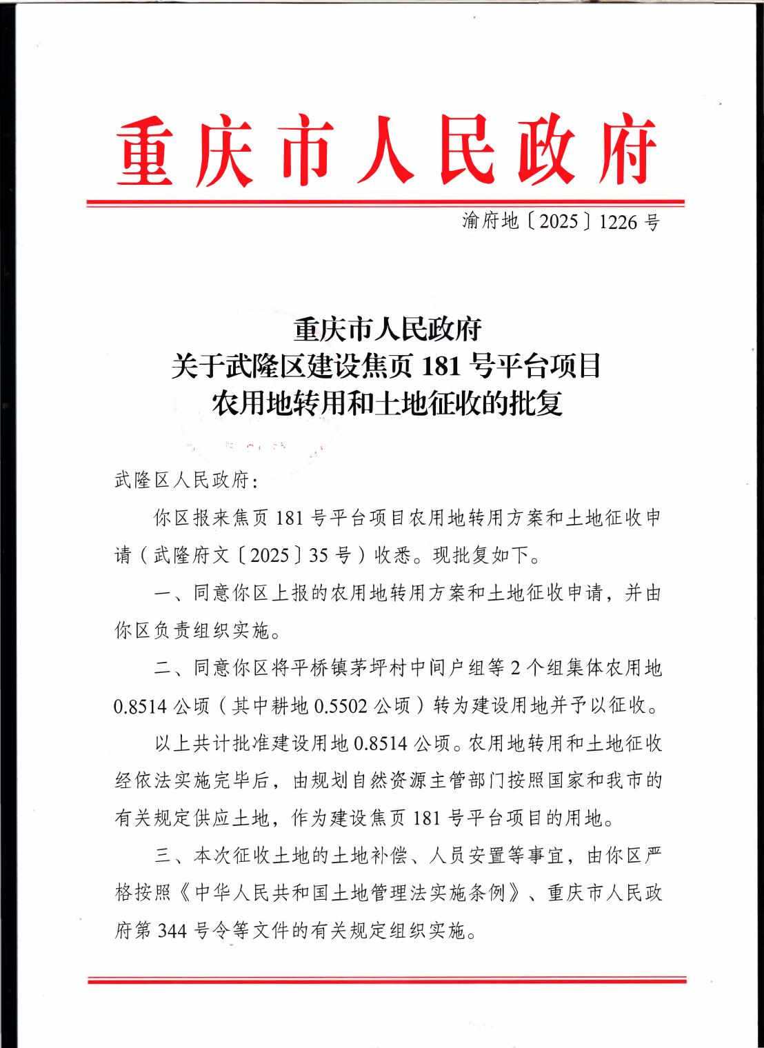 重庆市人民政府关于武隆区建设焦页181号平台项目农用地转用和土地征收的批复