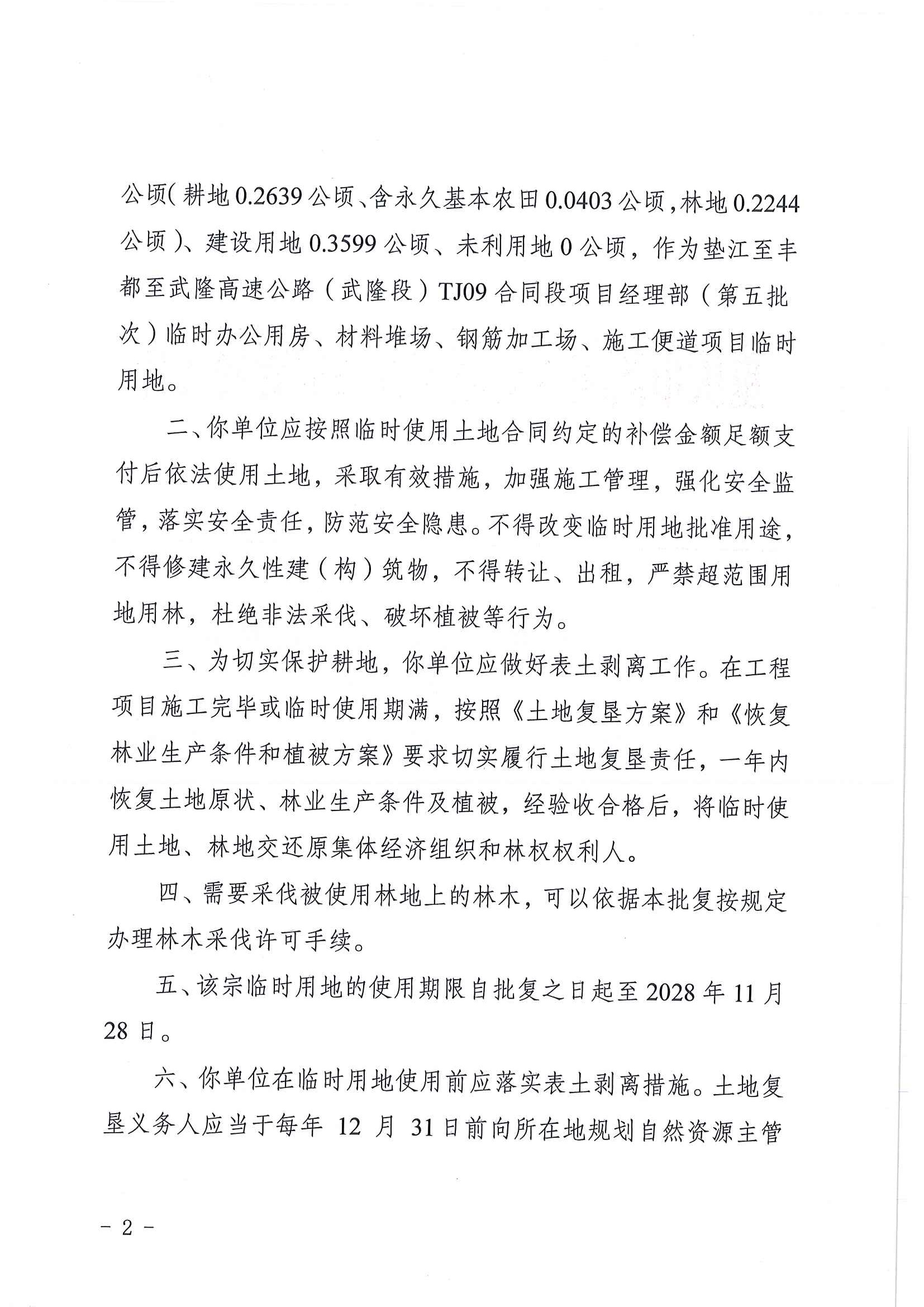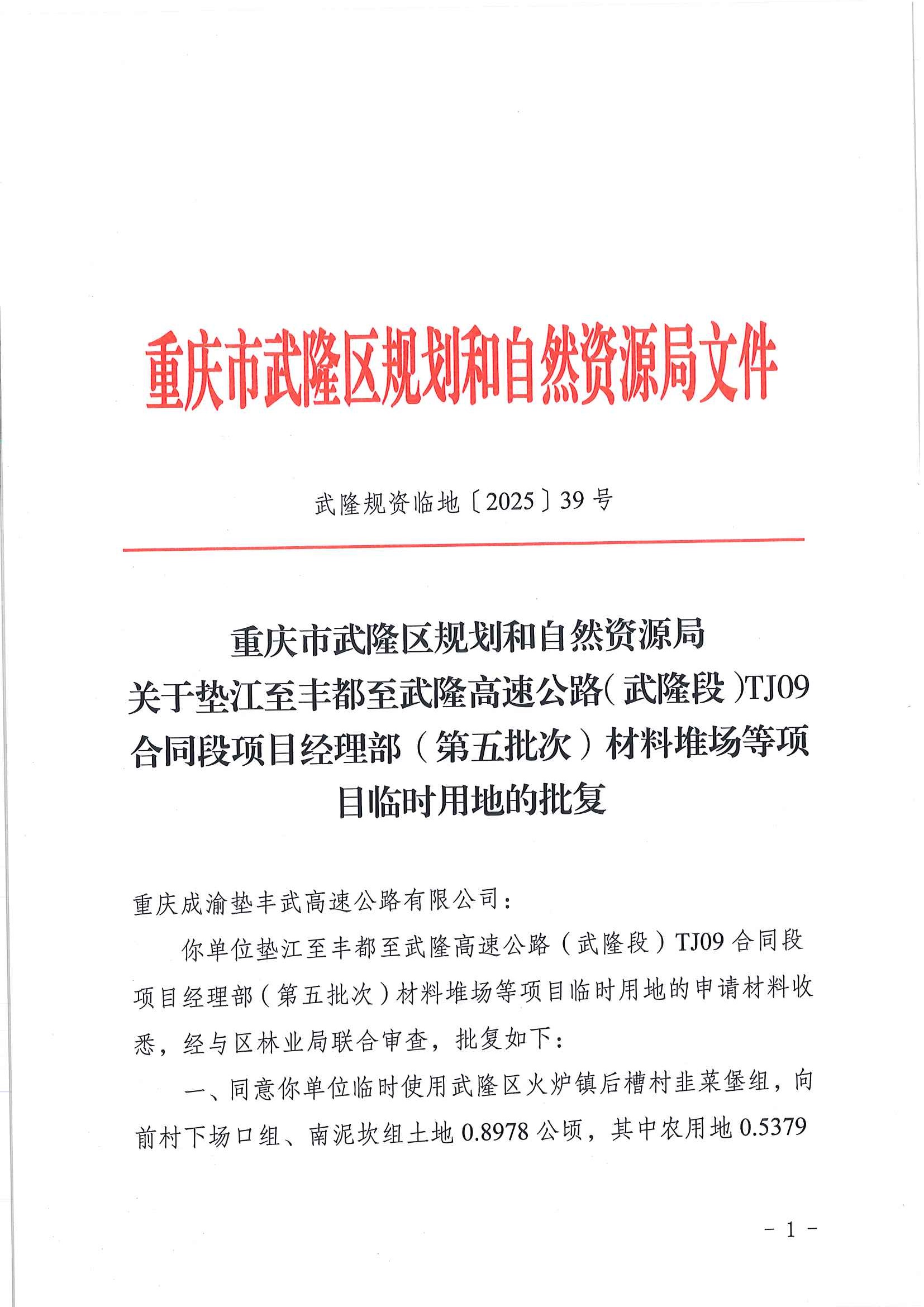 重庆市武隆区规划和自然资源局关于垫江至丰都至武隆高速公路(武隆段)TJ09合同段项目经理部(第五批次)材料堆场等项目临时用地的批复