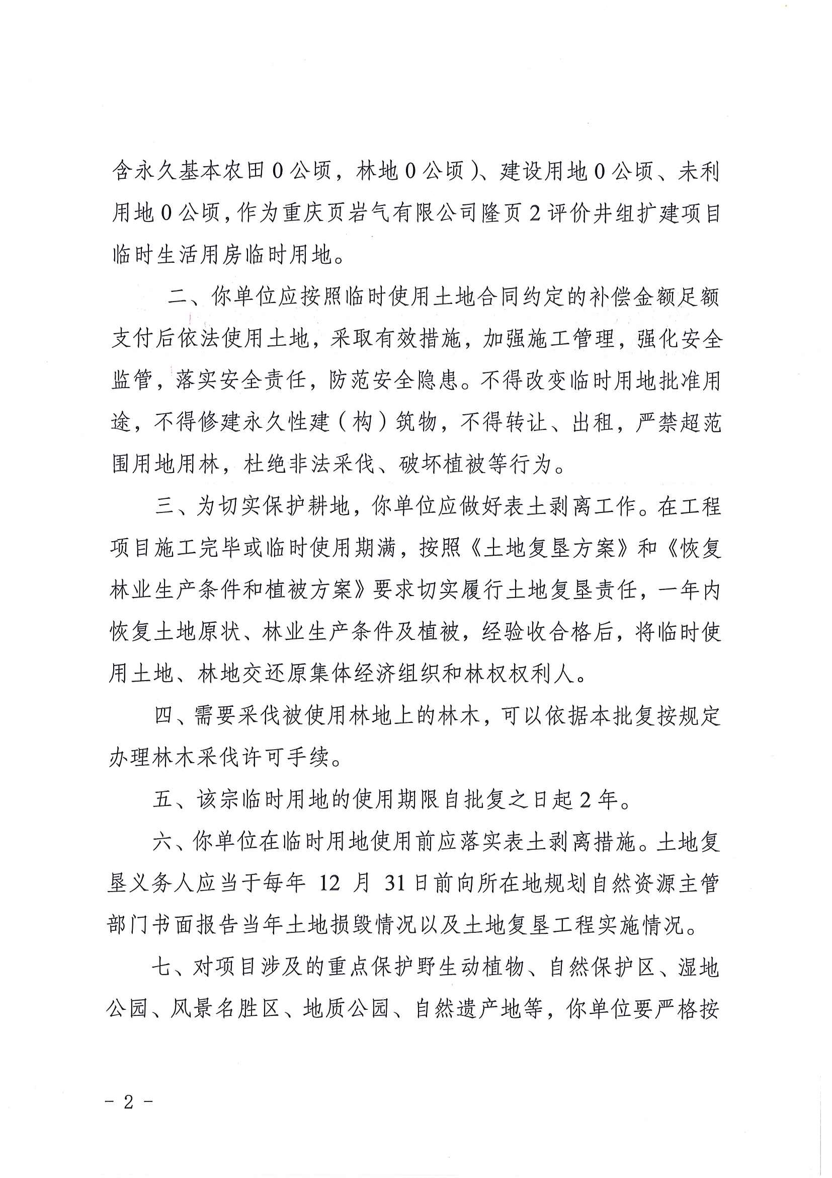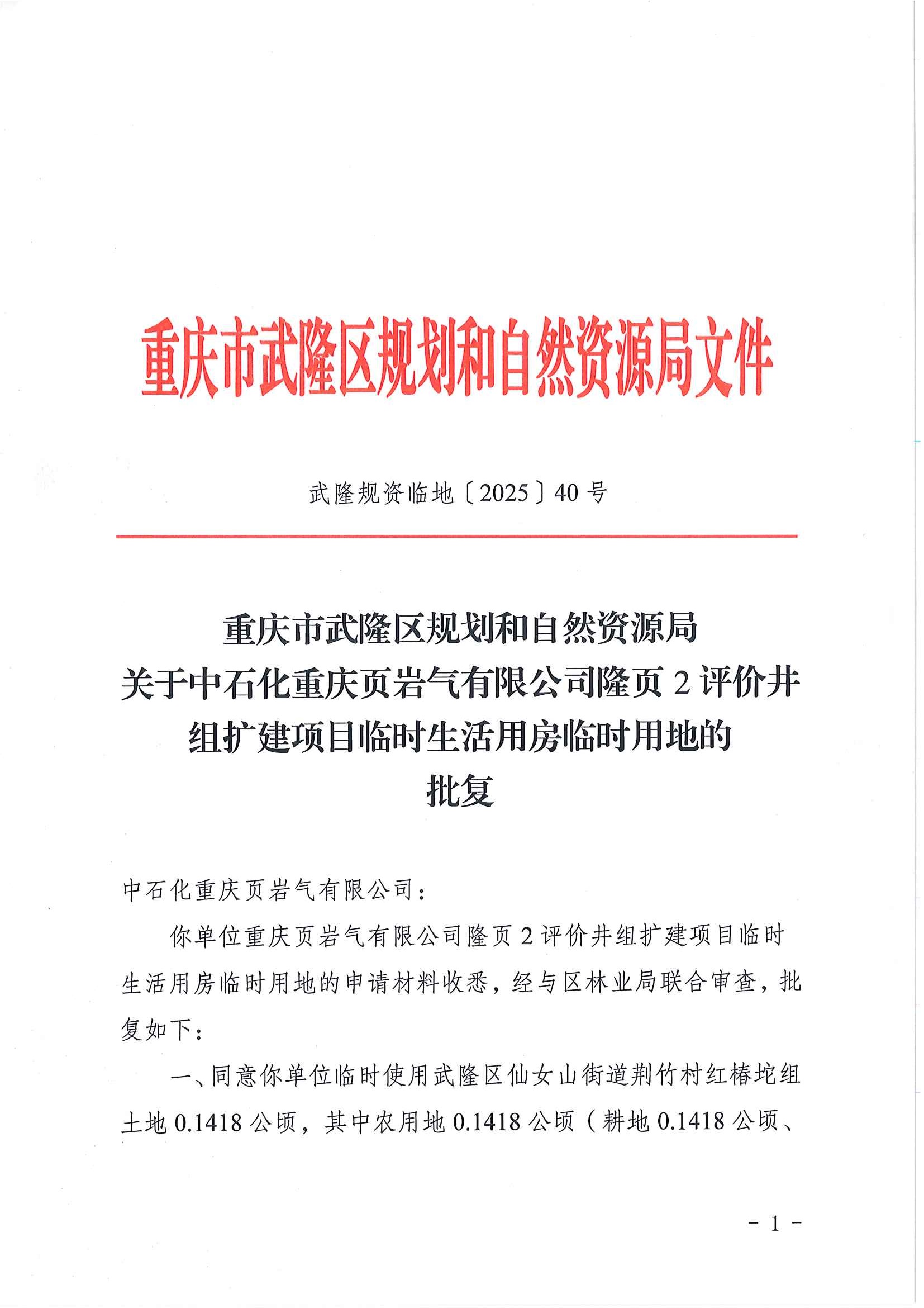 重庆市武隆区规划和自然资源局关于中石化重庆页岩气有限公司隆页2评价井组扩建项目临时生活用房临时用地的批复