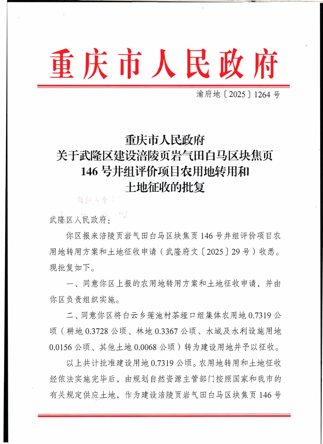 重庆市人民政府关于武隆区建设涪陵页岩气田白马区块焦页146号井组评价项目农用地转用和土地征收的批复