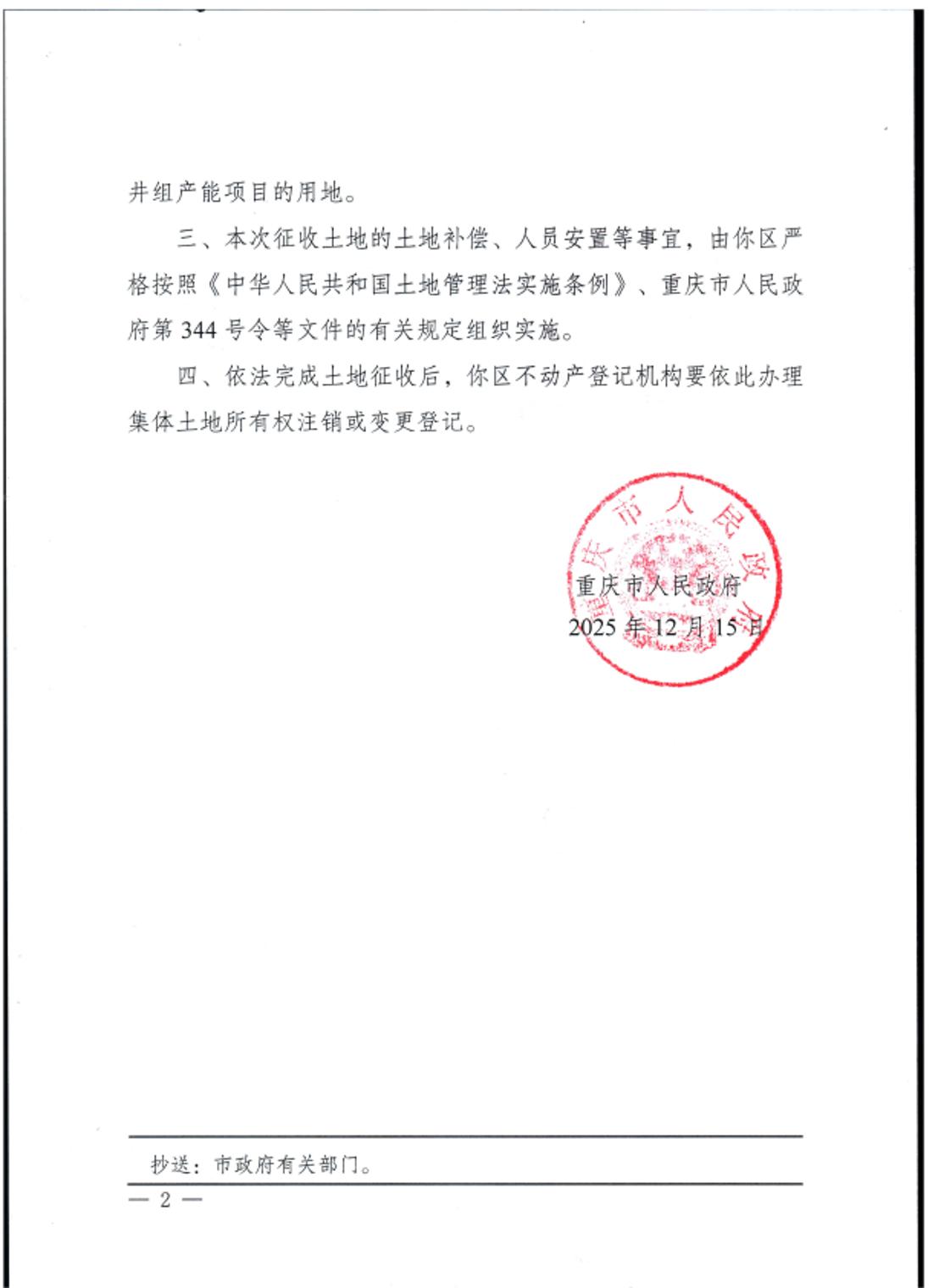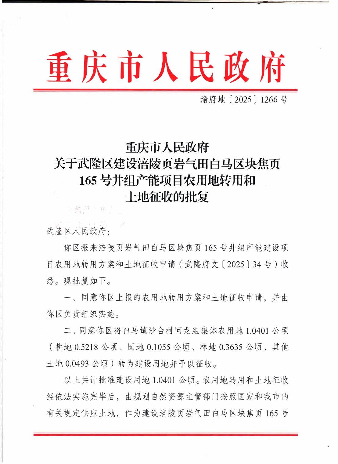 重庆市人民政府关于武隆区建设涪陵页岩气田白马区块焦页165号井组产能项目农用地转用和土地征收的批复