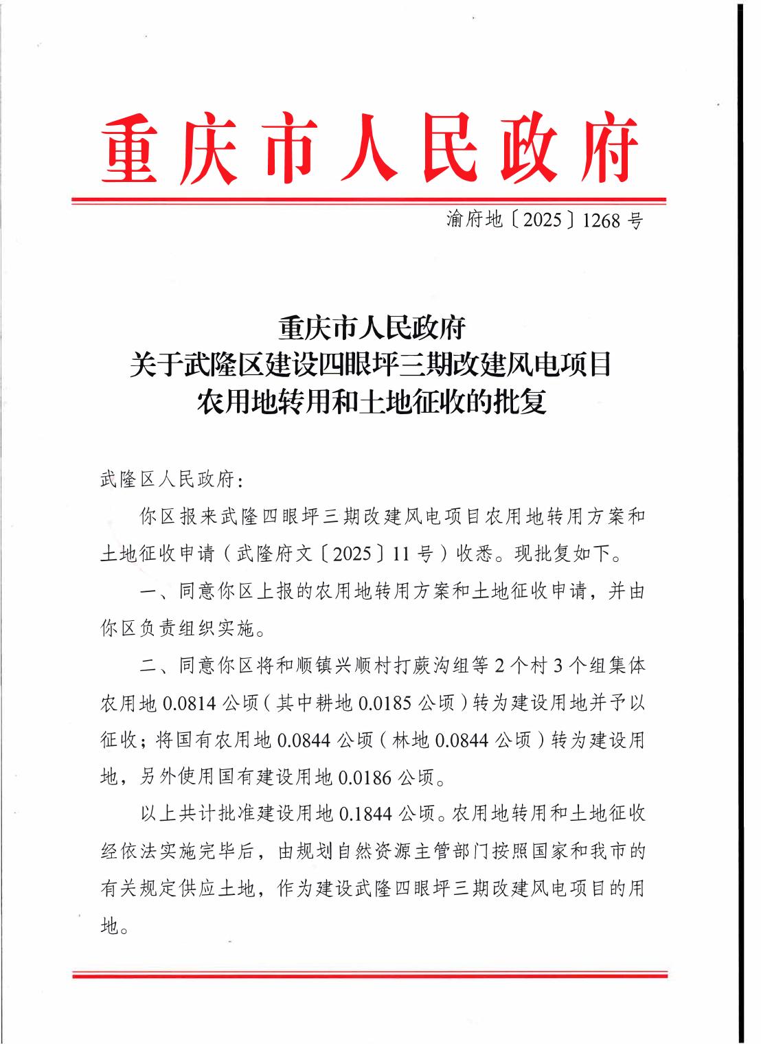 重庆市人民政府关于武隆区建设四限坪三期改建风电项目农用地转用和土地征收的批复