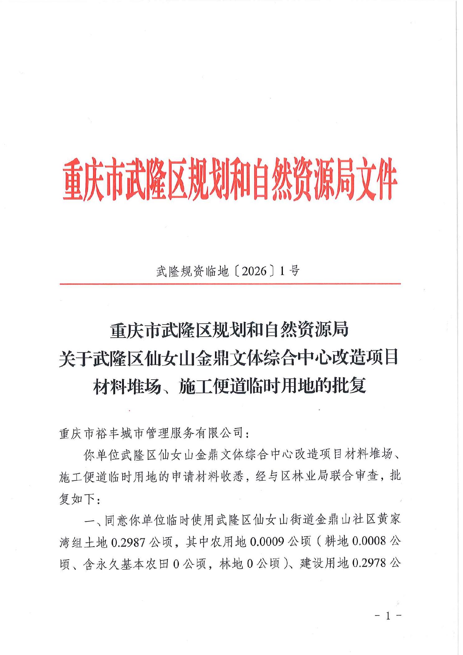 重庆市武隆区规划和自然资源局关于武隆区仙女山金鼎文体综合中心改造项目材料堆场、施工便道临时用地的批复