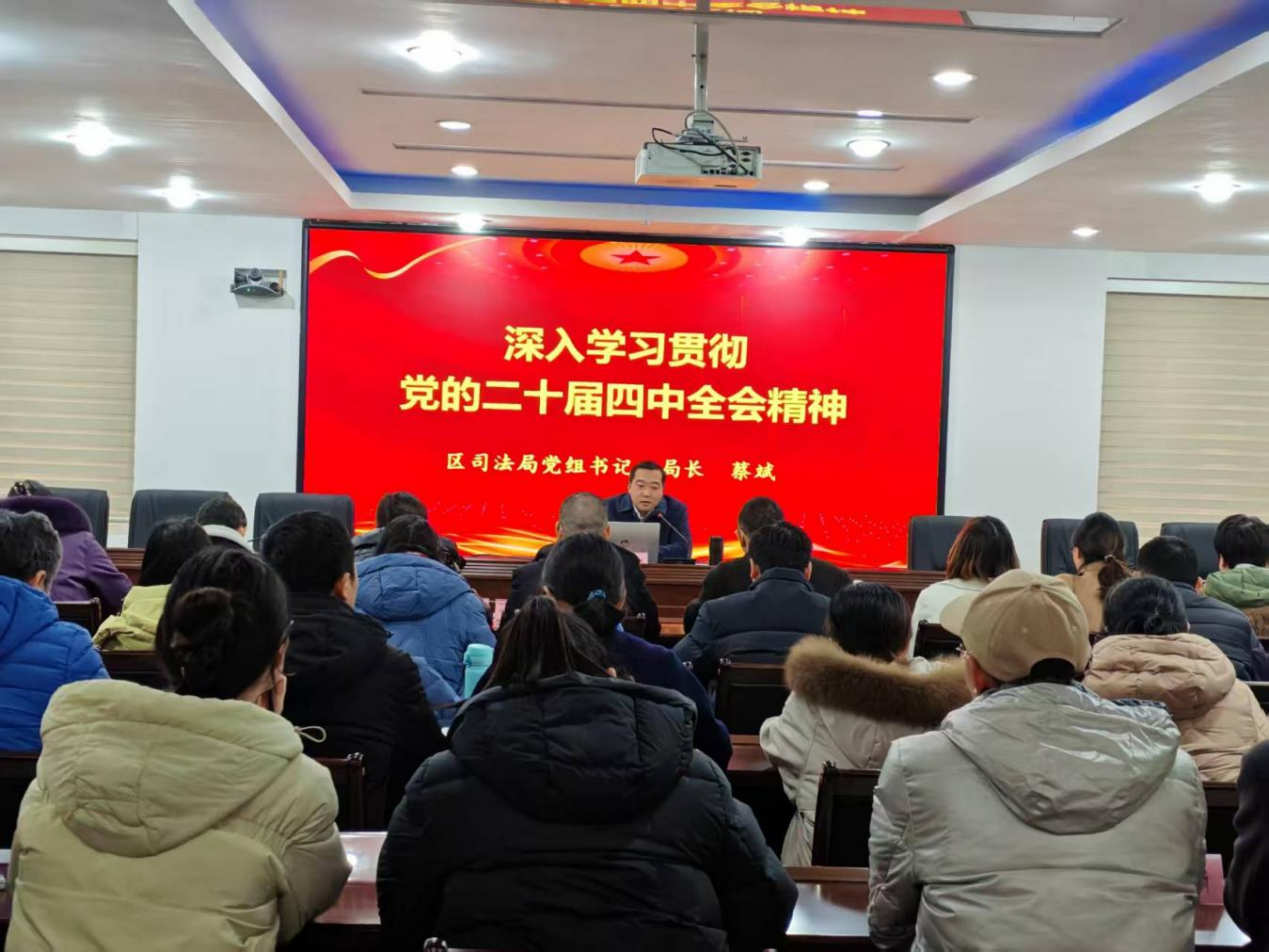 为深入学习贯彻党的二十届四中全会精神,准确把握新时代新征程的使命任务,切实把思想和行动统一到党中央决策部署和市委、区委工作要求上来,1月15日上午,区司法局党组书记、局长蔡斌在局三楼会议室,为区司法局、区大数据局全体干部职工作党的二十届四中全会精神专题宣讲。