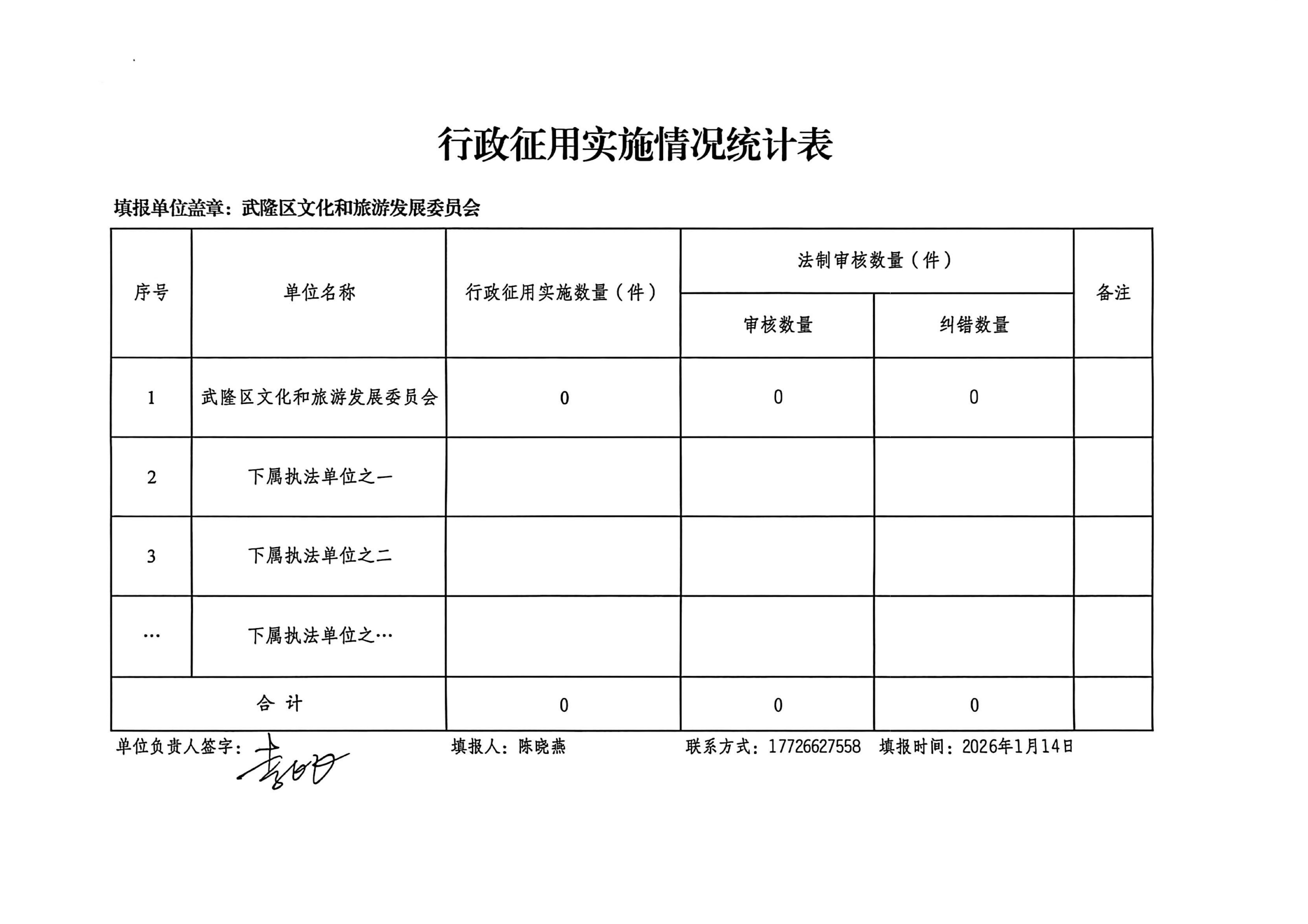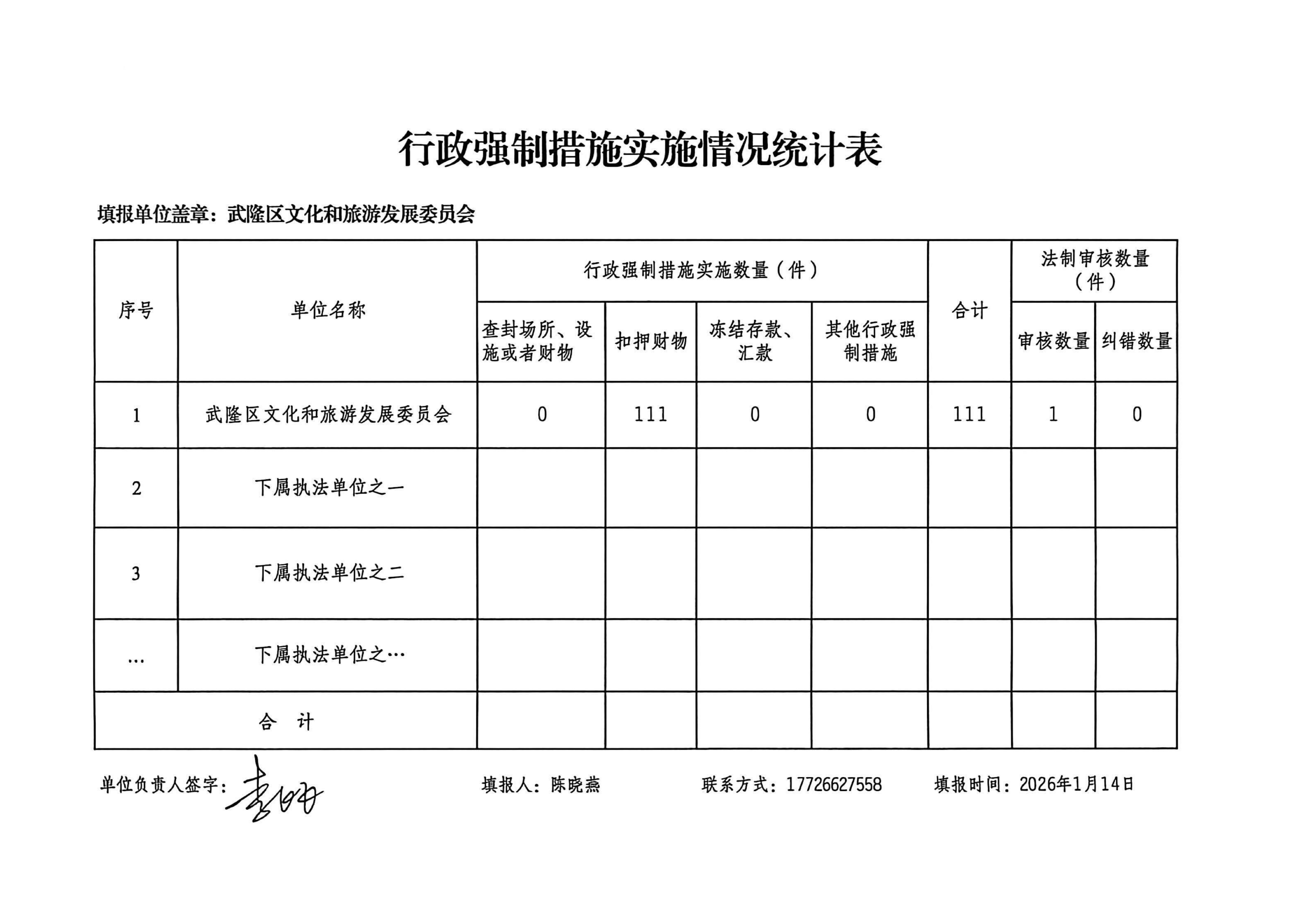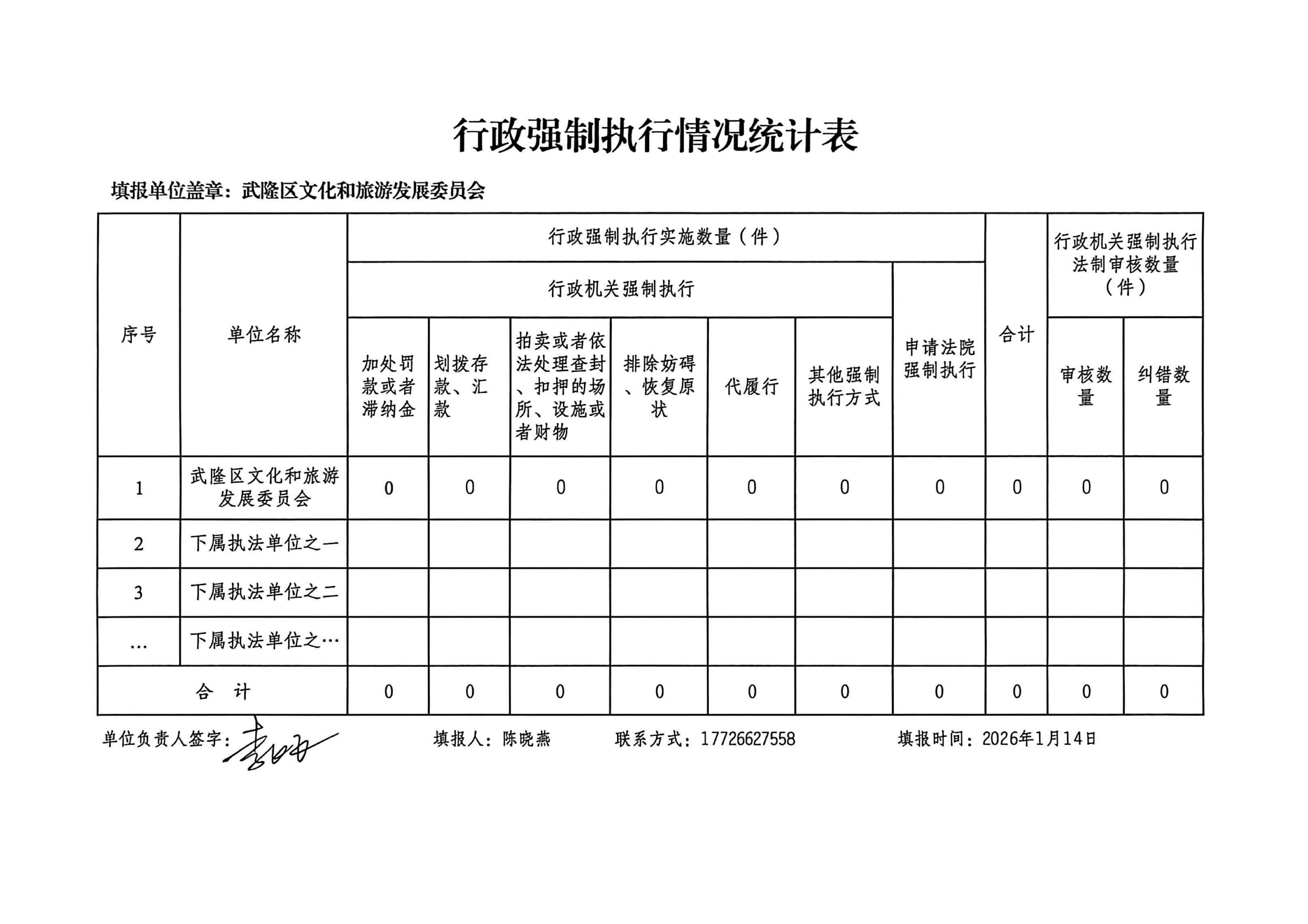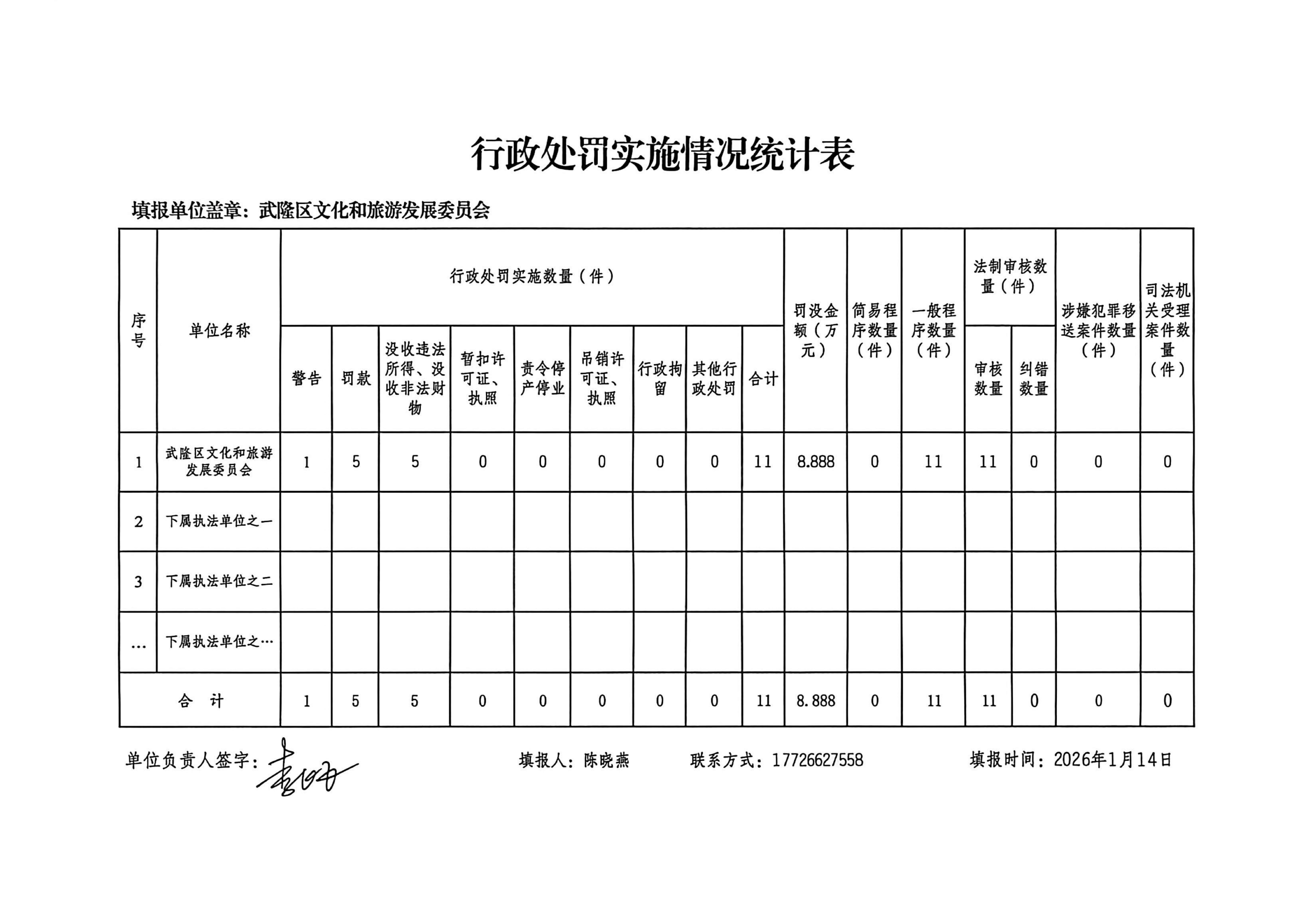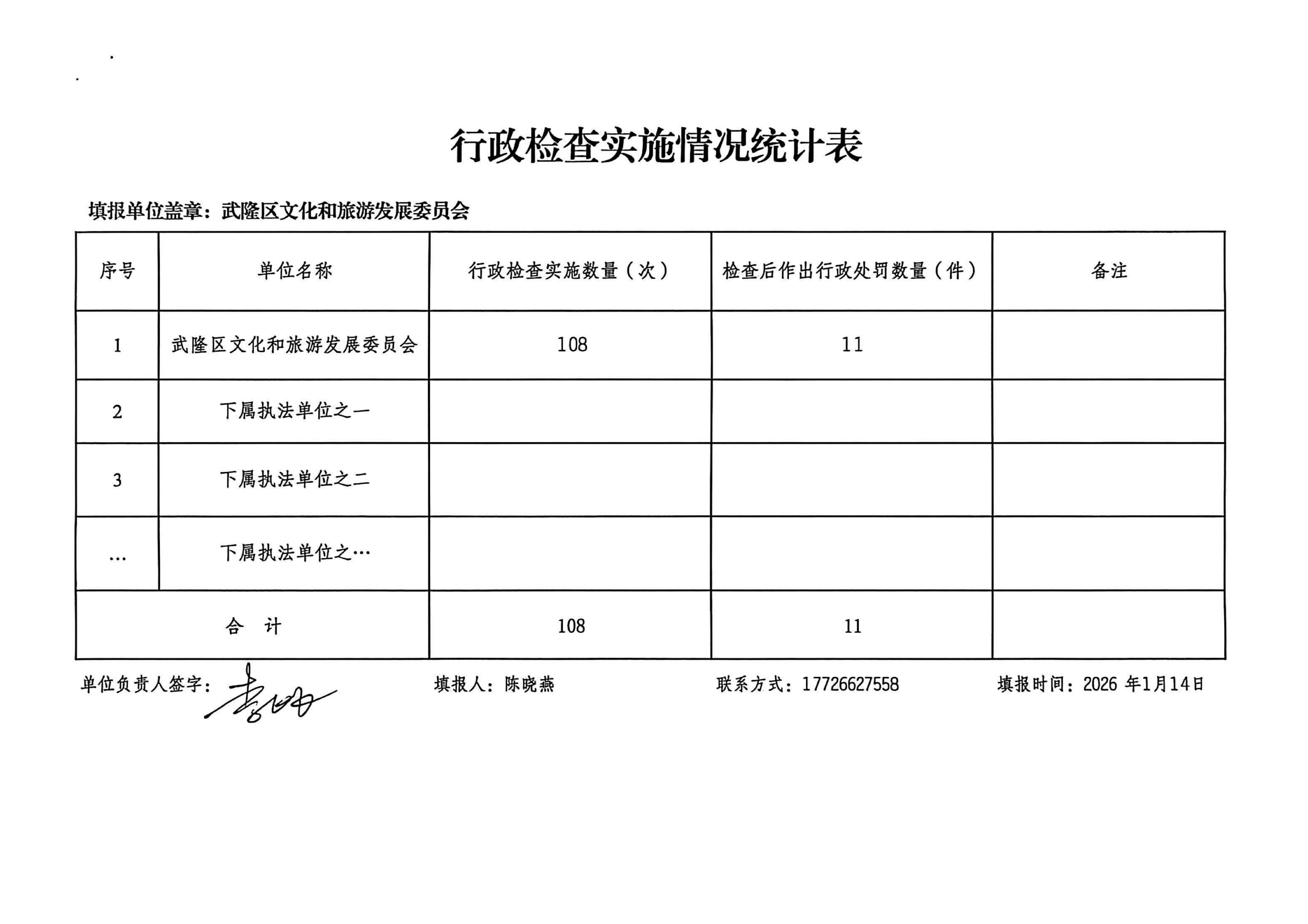 重庆市武隆区文化和旅游发展委员会2025年度行政执法数据统计数据表