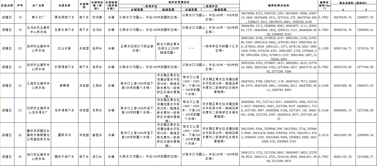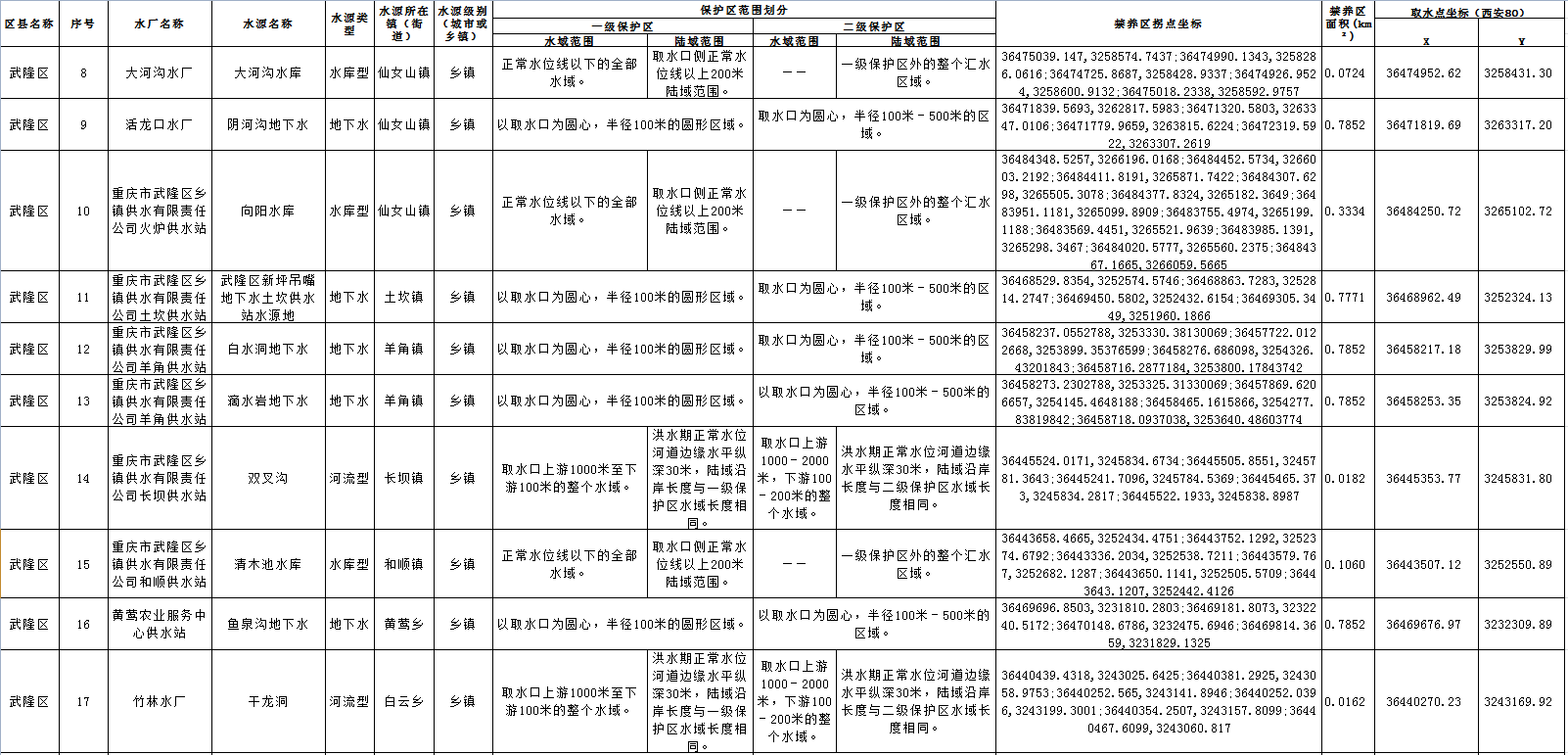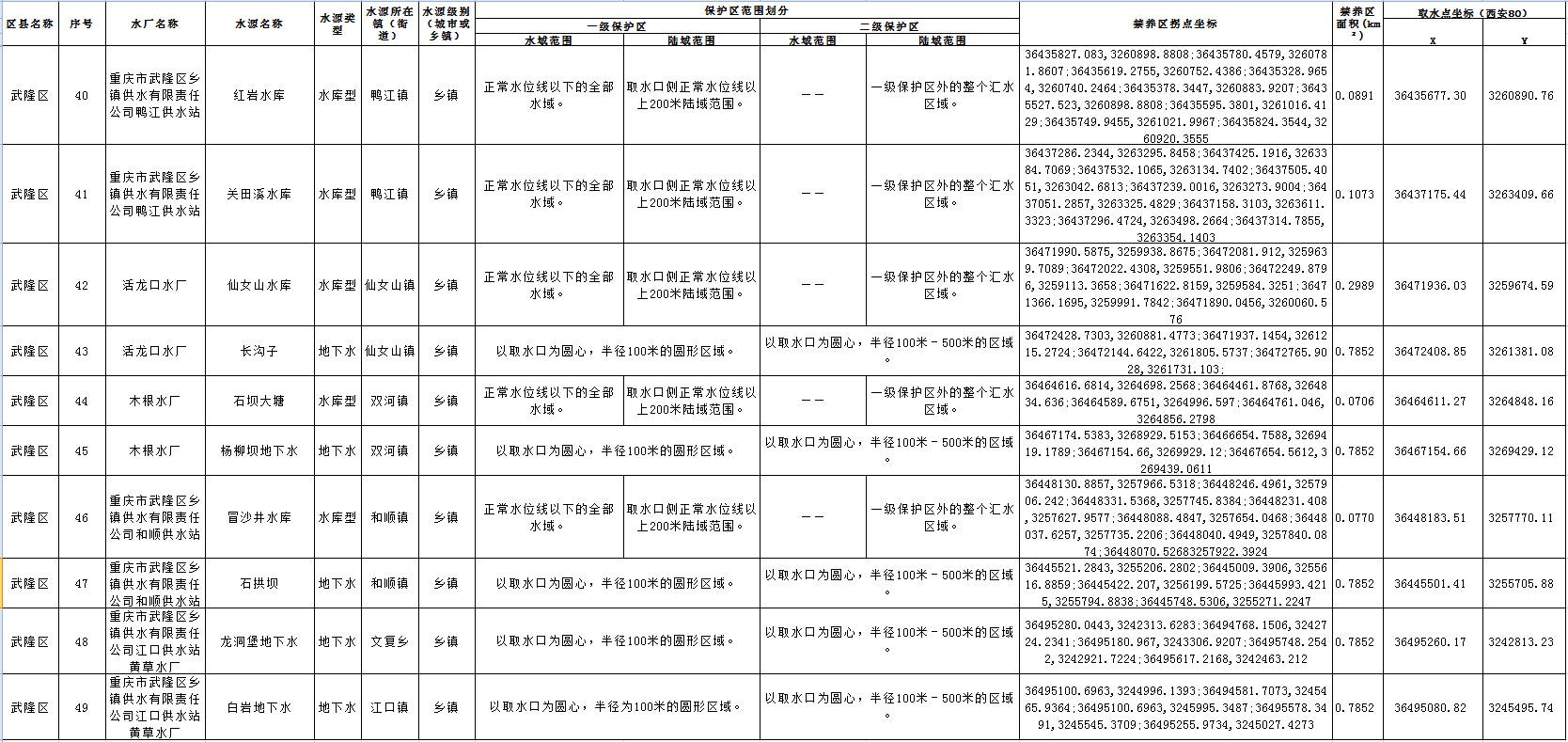 武隆区饮用水水源地基本情况。武隆区集中式饮用水水源地共49个,按水源类型划分,包括河流型15个,水库型14个,地下水型20个。武隆区饮用水水源一级保护区和二级保护区共划定35.5682平方公里。武隆区饮用水源具体情况见下表3-1。