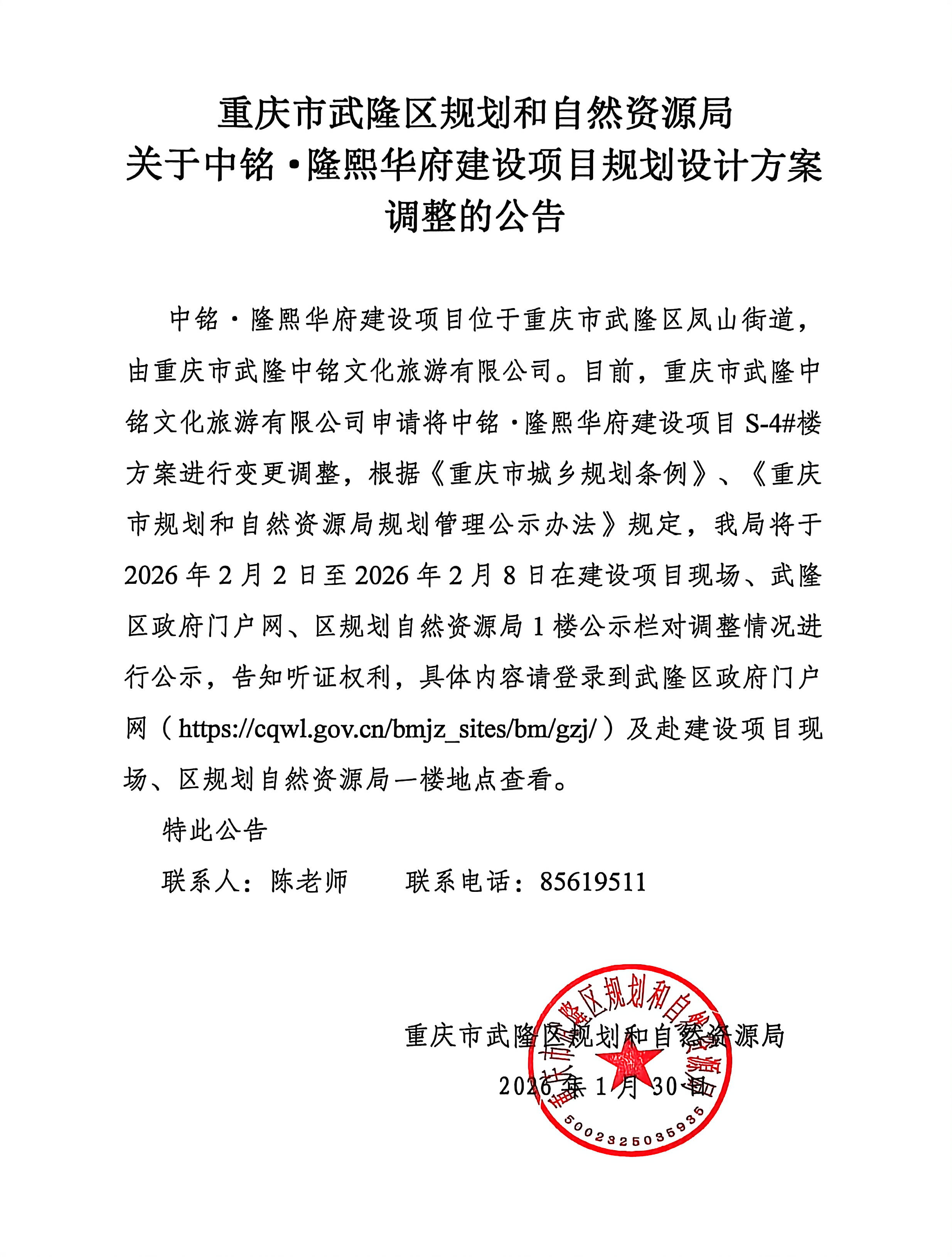 重庆市武隆区规划和自然资源局关于中铭▪隆熙华府建设项目规划设计方案调整的公告