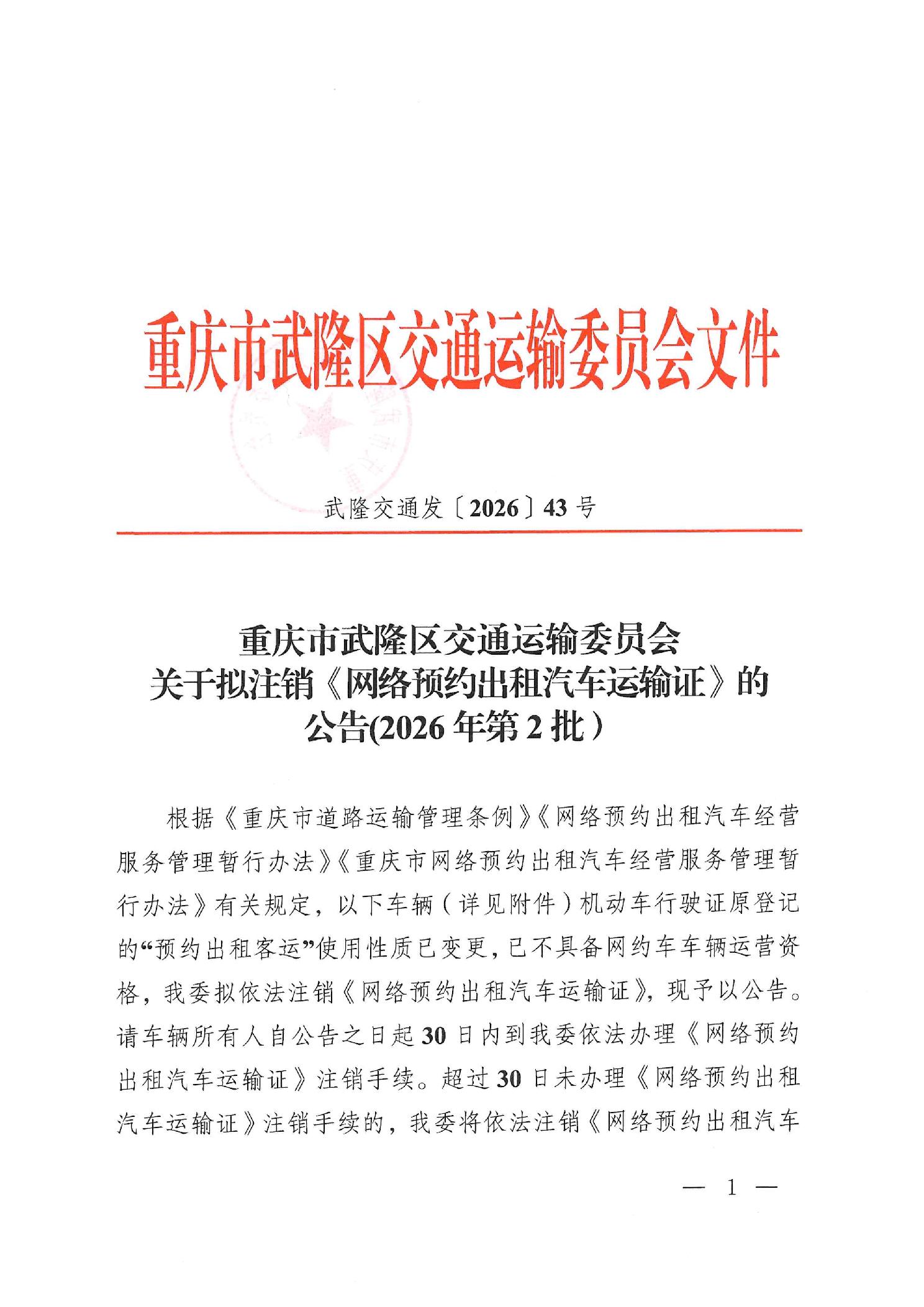 重庆市武隆区交通运输委员会关于拟注销《网络预约出租汽车运输证》的 公告(2026年第2批)