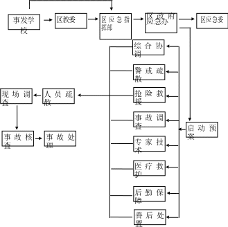 现场指挥部指挥长:分管教育副区长,副指挥长:区应急局局长、区教委主任;下设综合协调组、警戒疏散组、抢险施救组、专家技术组、医疗救护组、事故调查组、后勤保障和善后处置组。