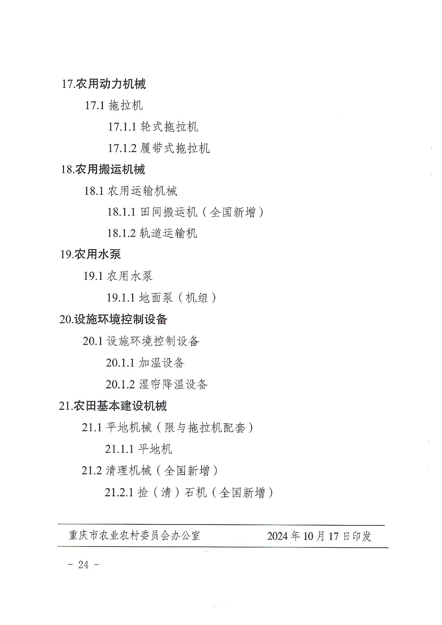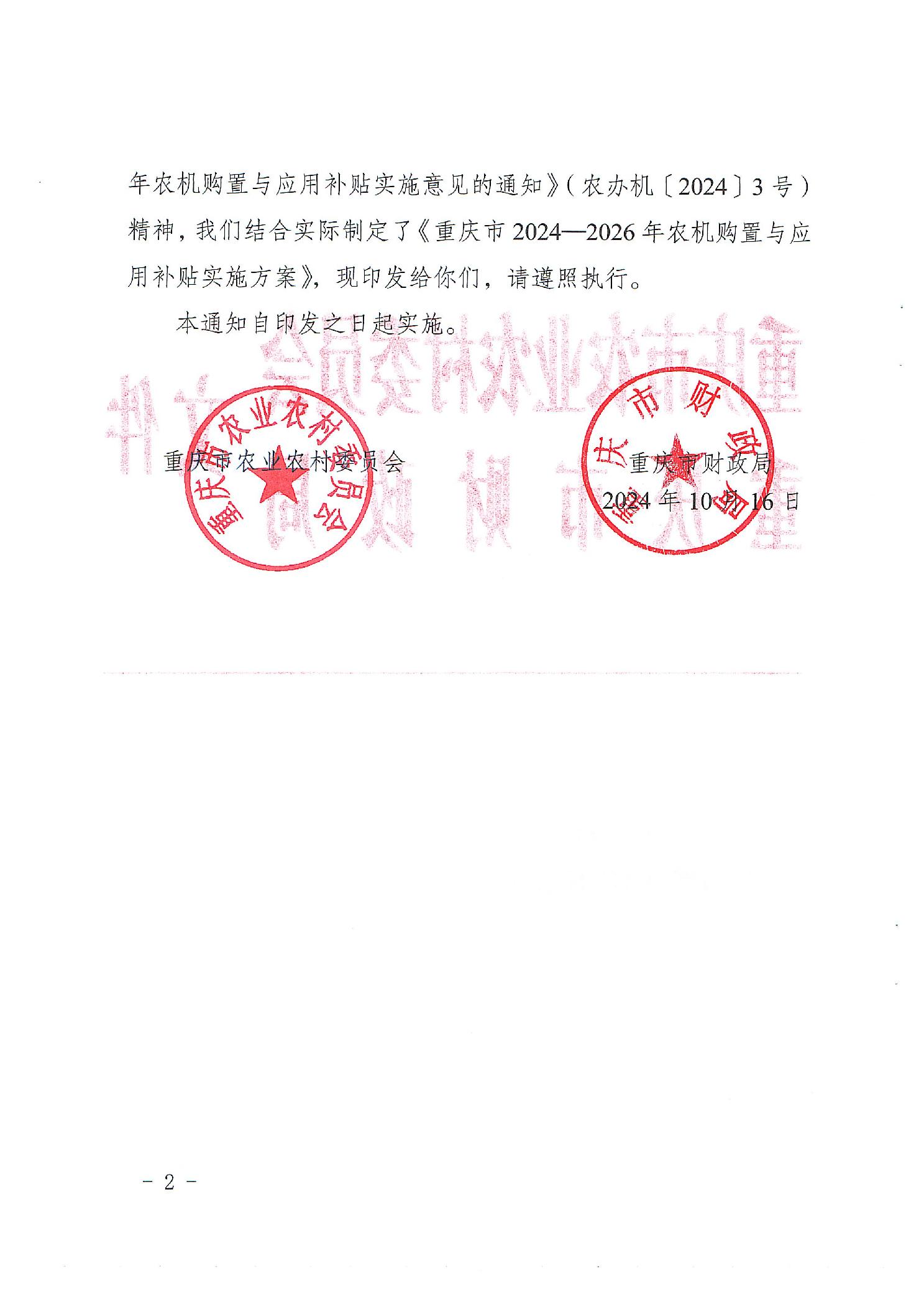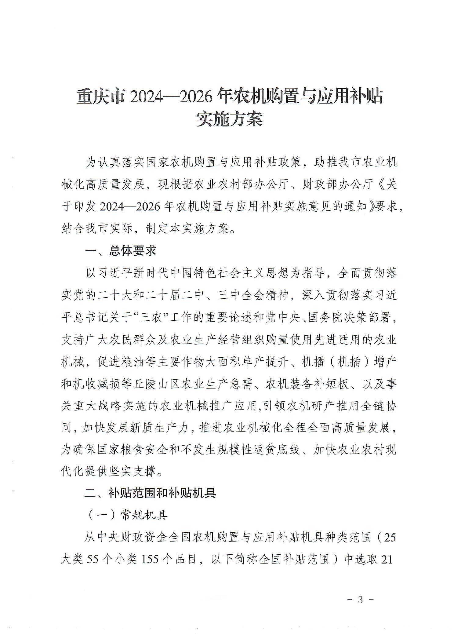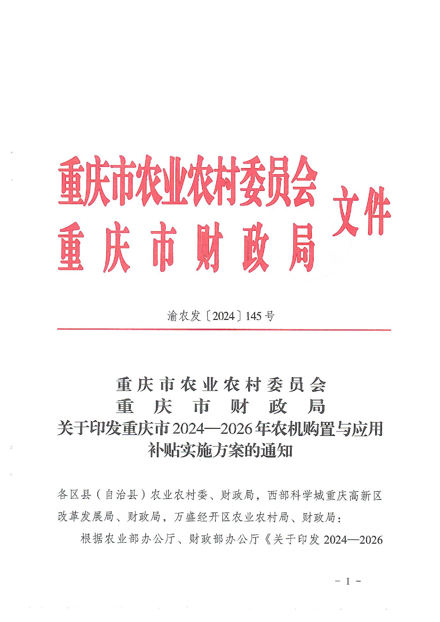 重庆市农业农村委员会、重庆市财政局关于印发2024-2026年农机购置与应用补贴实施方案的通知