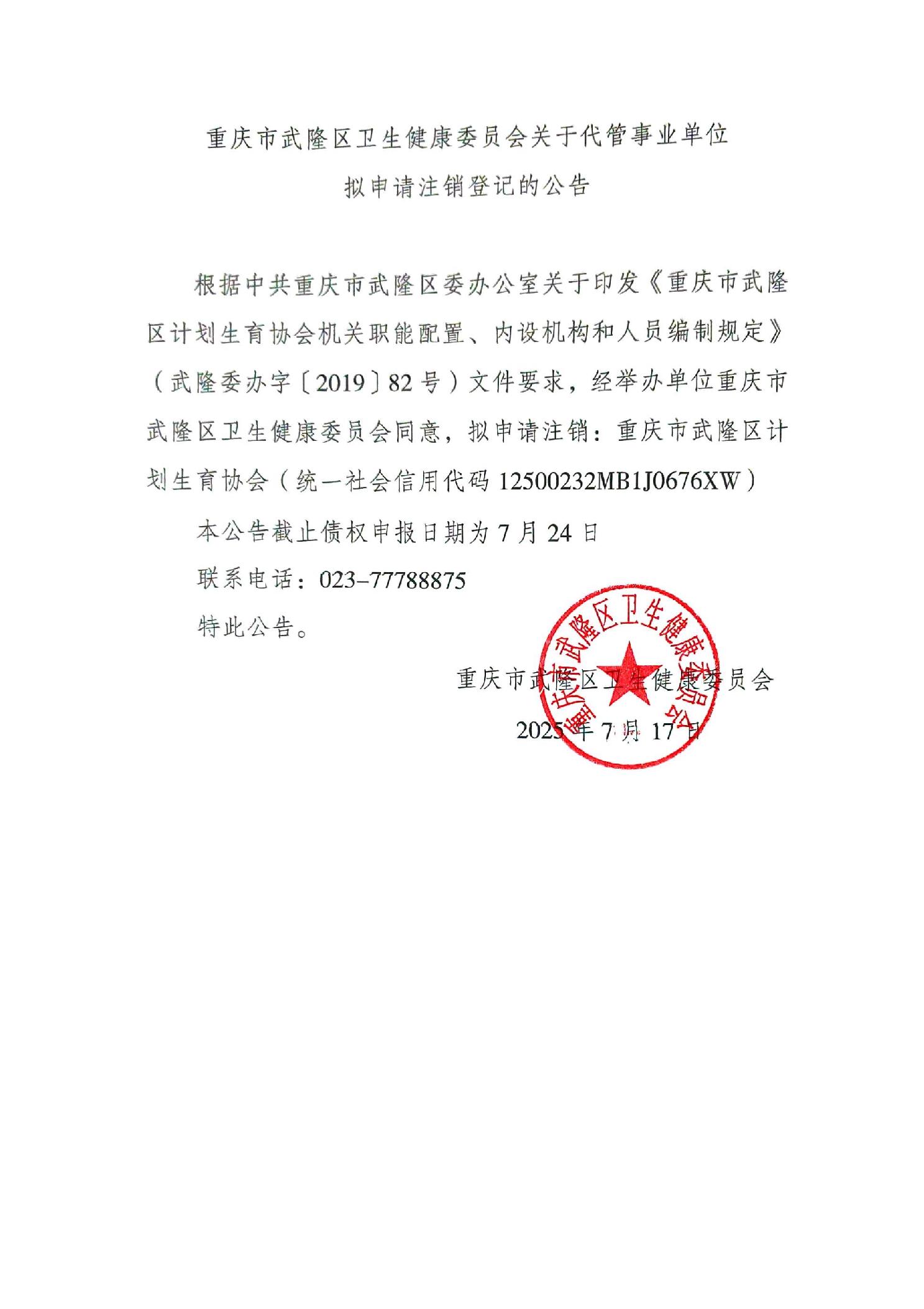 重庆市武隆区卫生健康委员会关于代管事业单位拟申请注销登记的公告