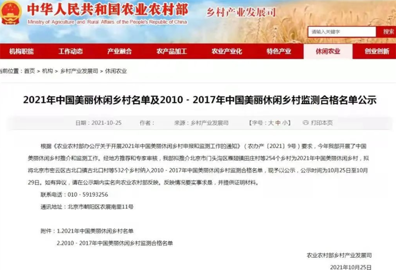 据了解,中国美丽休闲乡村以行政村为主体单位,需具有特色优势明显、服务设施完善、乡风民俗良好、品牌效应明显等特点。在特色优势方面,要求自然环境优美、生态资源丰富,村落民居原生状态保持完整,产业特色突出,一二三产业加快融合,乡村休闲旅游成为乡村经济发展的主导产业之一,就地吸纳农民创业就业容量大,乡村休闲旅游业联农带农作用突出。