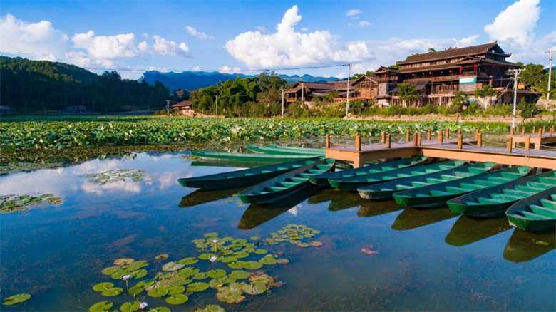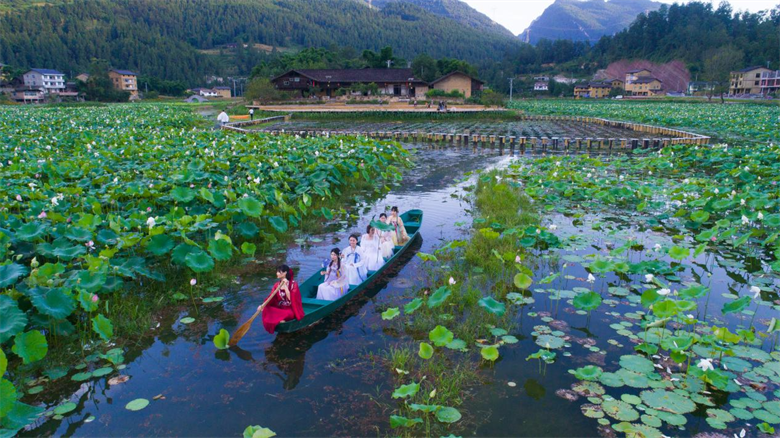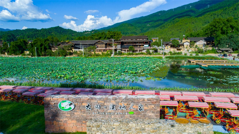 沧沟乡大田村凭借其良好的生态资源和悠久的古寨历史,着力打造集观光、休闲、度假、体验于一体的综合性旅游景区。其大田湿地人家乡村旅游示范点于2020年建成开放,当地以花为媒,开发了环湖自行车,荷塘游船,木棕河漂流等旅游项目,目前有古村落度假区、荷莲文化展示区、荷花湖观光区、自行车骑行区、步游道休闲区、木棕河漂流区和水上游乐区。