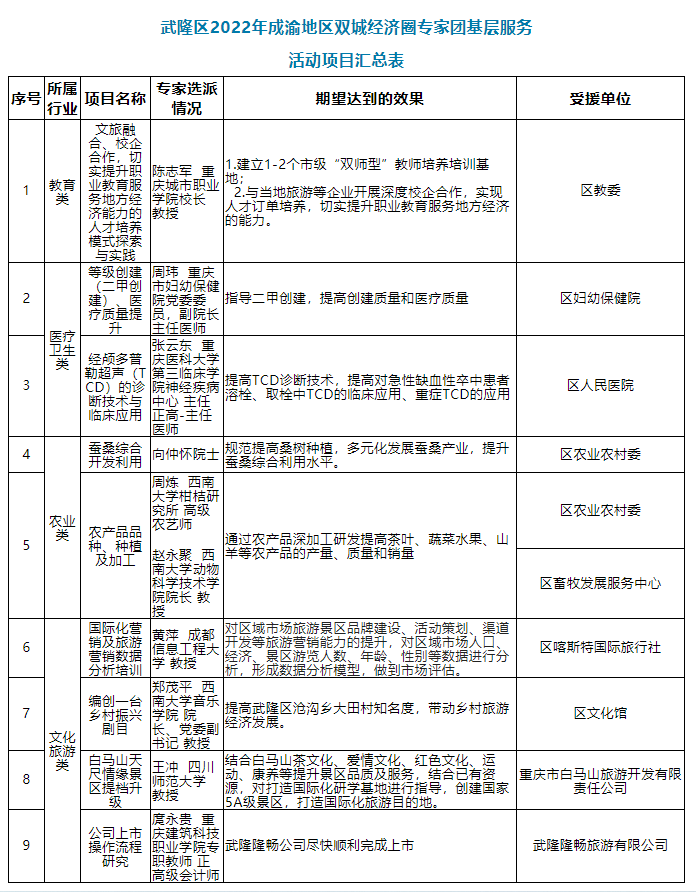 5月18日至20日,成渝双城经济圈专家团将走进武隆!为我区教育、医疗卫生、农业、文化旅游等领域提供智力帮扶。