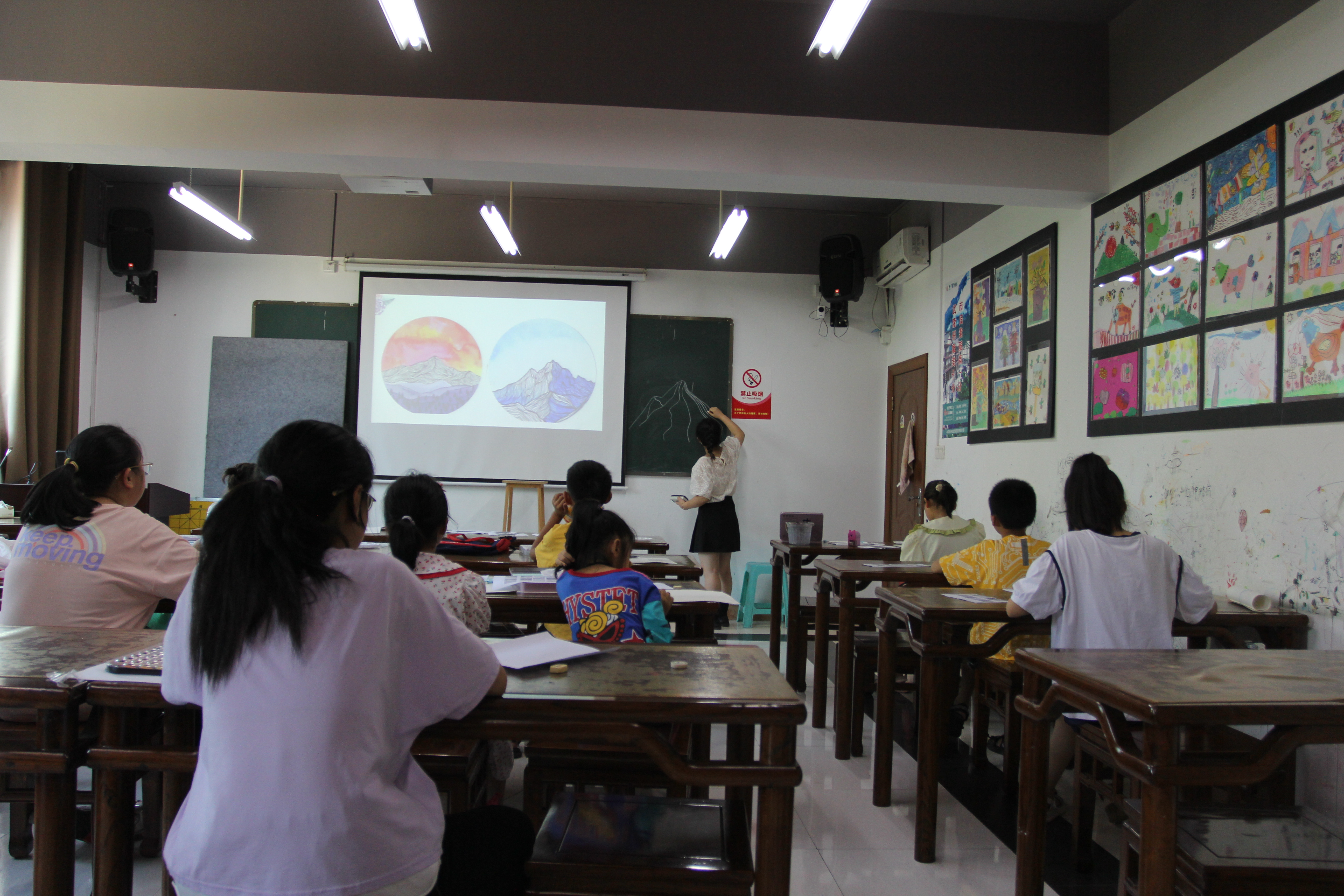 本次培训针对未成年人的兴趣爱好,开设语言、书法、美术等门类,包括朗诵、文学艺术、硬笔书法、水彩画、水粉画共5个艺术培训班,分别由文化馆专业教师和外聘的相关课程专业教师授课,近150位同学参加培训。