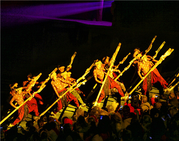 据了解,大型山水实景演出《印象武隆》主要以国家级非物质文化遗产“川江号子”为主线,将“号子”、“哭嫁”等传承千年却即将消失的民俗形式以及“棒棒”“滑竿”“麻辣火锅”等最具重庆特色的人文元素相融合,以真山、真水为舞台背景,在70分钟的演出中,再现民间音乐抬石号子、火锅制作技艺、乌江船工号子、哭嫁等巴渝本土文化,弘扬坚韧不拔、团结协作、顽强拼搏、乐观豁达的纤夫精神。