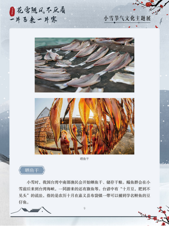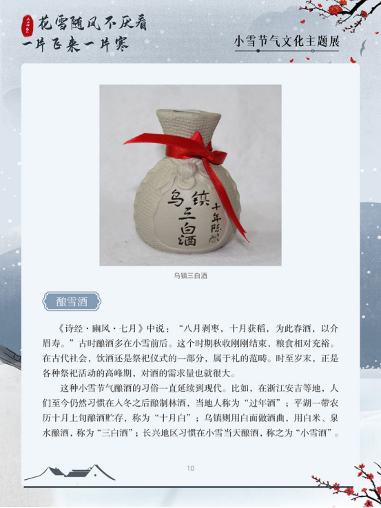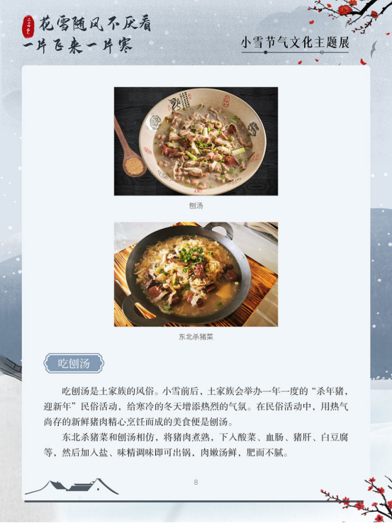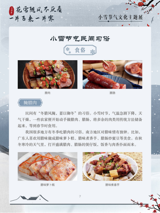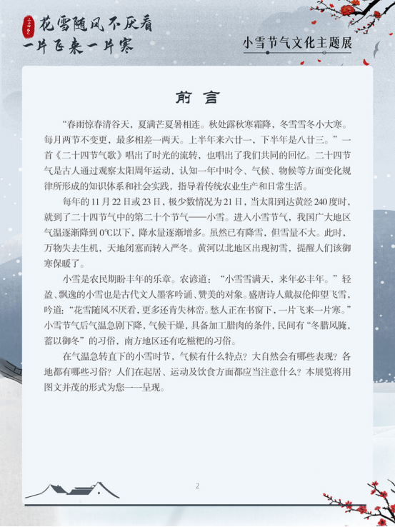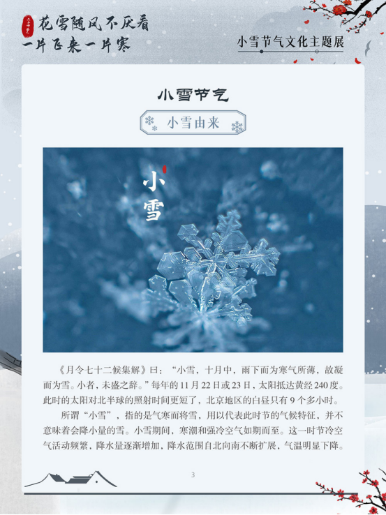 小雪是中国二十四节气中的第二十个节气,时间在每年的11月22日或23日,极少数情况为21日,此时也是寒潮和强冷空气活动频繁的时期。小雪节气的到来,意味着万物失去生机,天地闭塞而转入严冬,黄河以北地区开始出现降雪。在气温急转直下的小雪时节,气候有什么特点?大自然会有哪些表现?各地都有哪些习俗?人们在起居、运动及饮食方面都应当注意什么?本展览将用图文并茂的形式为您一一呈现。