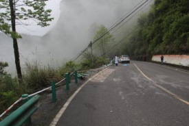 事发地点系重庆市武隆区凤山街道G353线1956km+450m处,道路宽8m,沥青路面,道路平坦,道路施划有标线,有一右转急弯(如图1),车行方向(从武隆往走马村方向)道路左侧临崖、安装有波形护栏,右侧为边沟临壁(如图2);车行方向为下坡长1500m,坡度6%,视线良好。