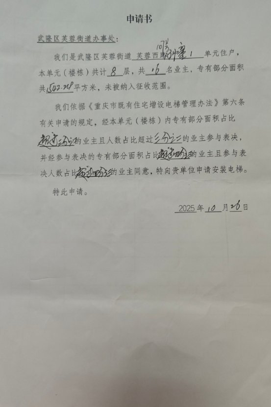 武隆区芙蓉街道芙蓉西路107号3幢1单元,其超过三分之二的楼栋业主于2025年11月向芙蓉街道办事处申请在所在楼栋增设电梯1部,现将申请书、申请人名单、增设电梯示意图进行现场公示,征求利害关系人意见。