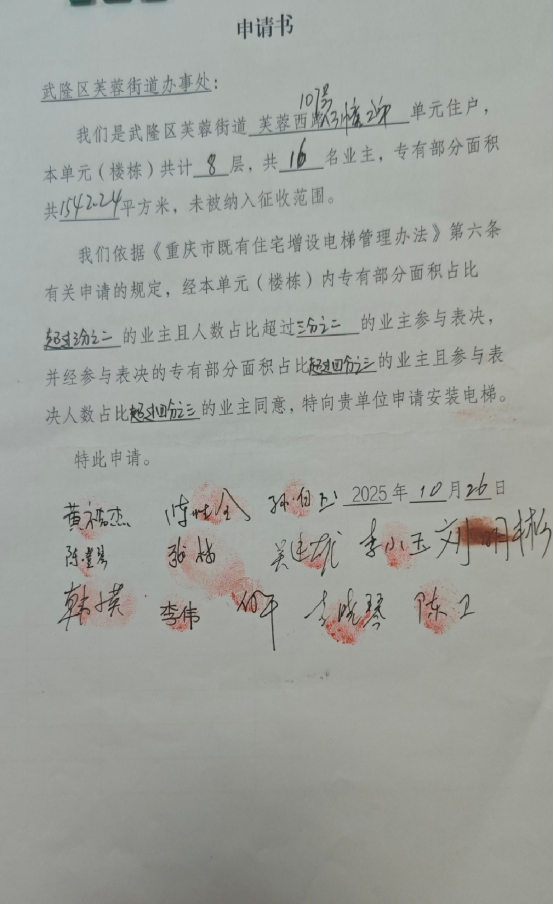 武隆区芙蓉街道芙蓉西路107号3幢2单元,其超过三分之二的楼栋业主于2025年11月向芙蓉街道办事处申请在所在楼栋增设电梯1部,现将申请书、申请人名单、增设电梯示意图进行现场公示,征求利害关系人意见。