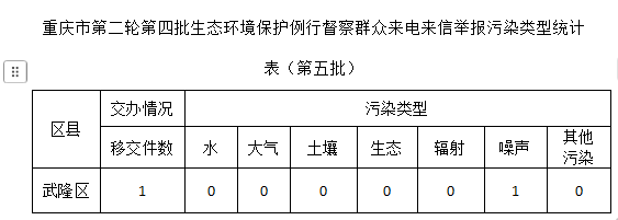 12月6日,重庆市第四生态环境保护督察组向武隆区移交第五批群众信访举报件1件,其中来电举报1件,来信举报0件。从信访举报件涉及的生态环境问题类型来看,涉及噪声1件。所有举报件均已及时转交相关部门、相关镇街处理。