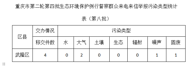 12月9日,重庆市第四生态环境保护督察组向武隆区移交第八批群众信访举报件4件,其中来电举报4件,来信举报0件。从信访举报件涉及的生态环境问题类型来看,涉及噪声1件,大气2件,固废1件。所有举报件均已及时转交相关部门、相关镇街处理。