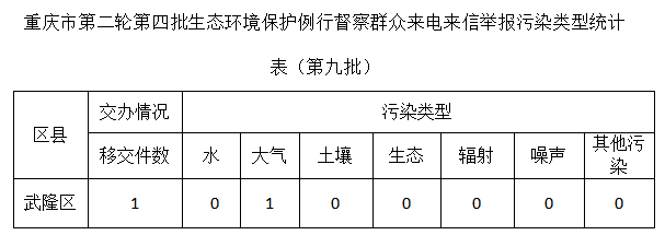 12月10日,重庆市第四生态环境保护督察组向武隆区移交第九批群众信访举报件1件,其中来电举报1件。从信访举报件涉及的生态环境问题类型来看,涉及大气1件。所有举报件均已及时转交相关部门、相关镇街处理。