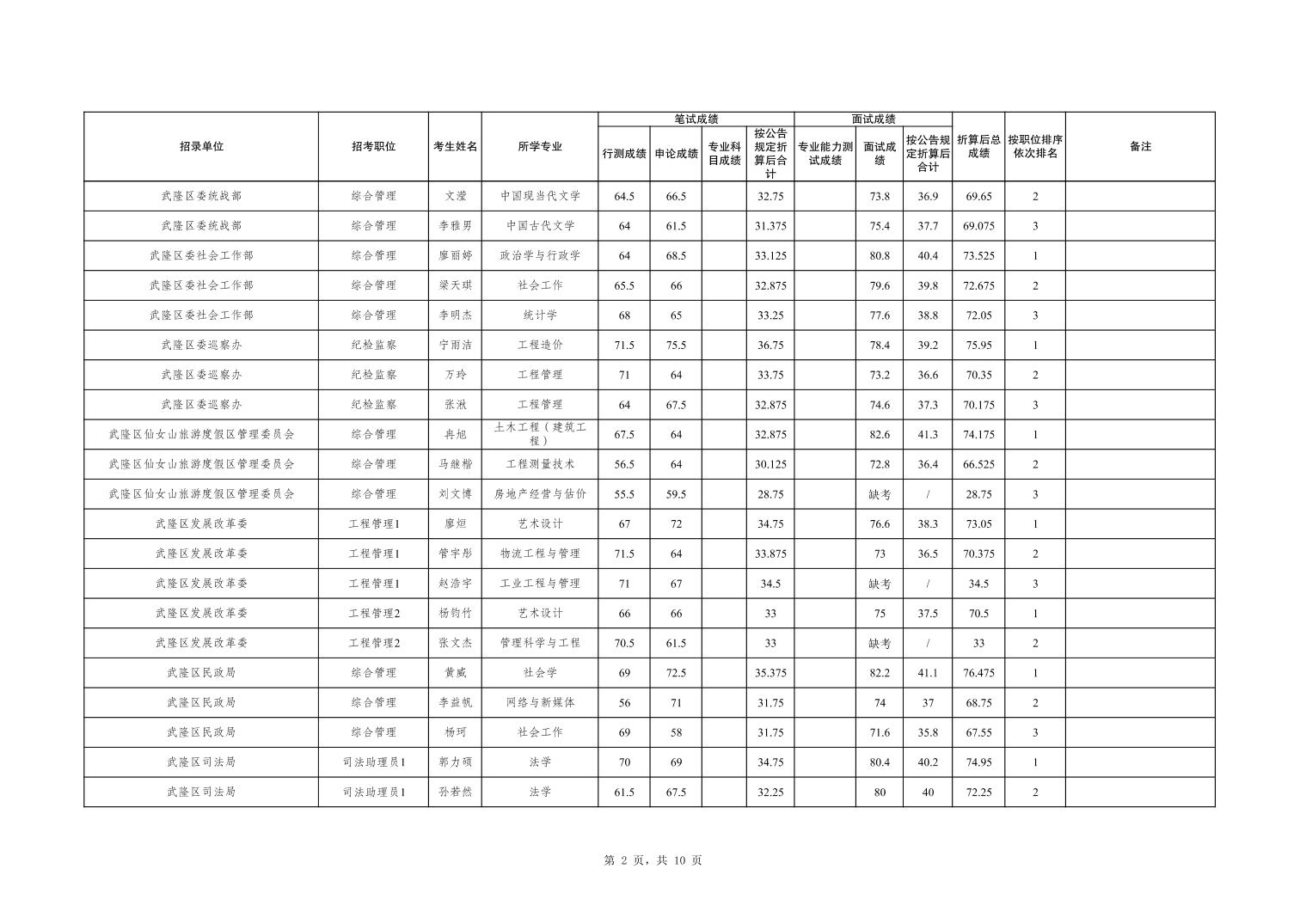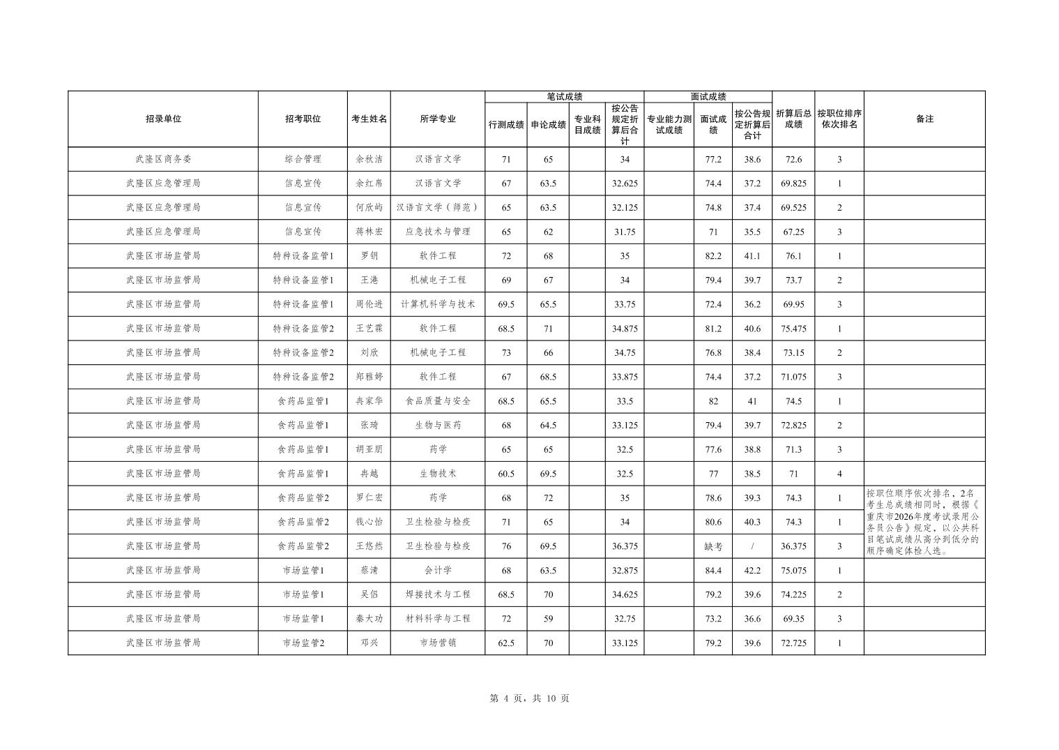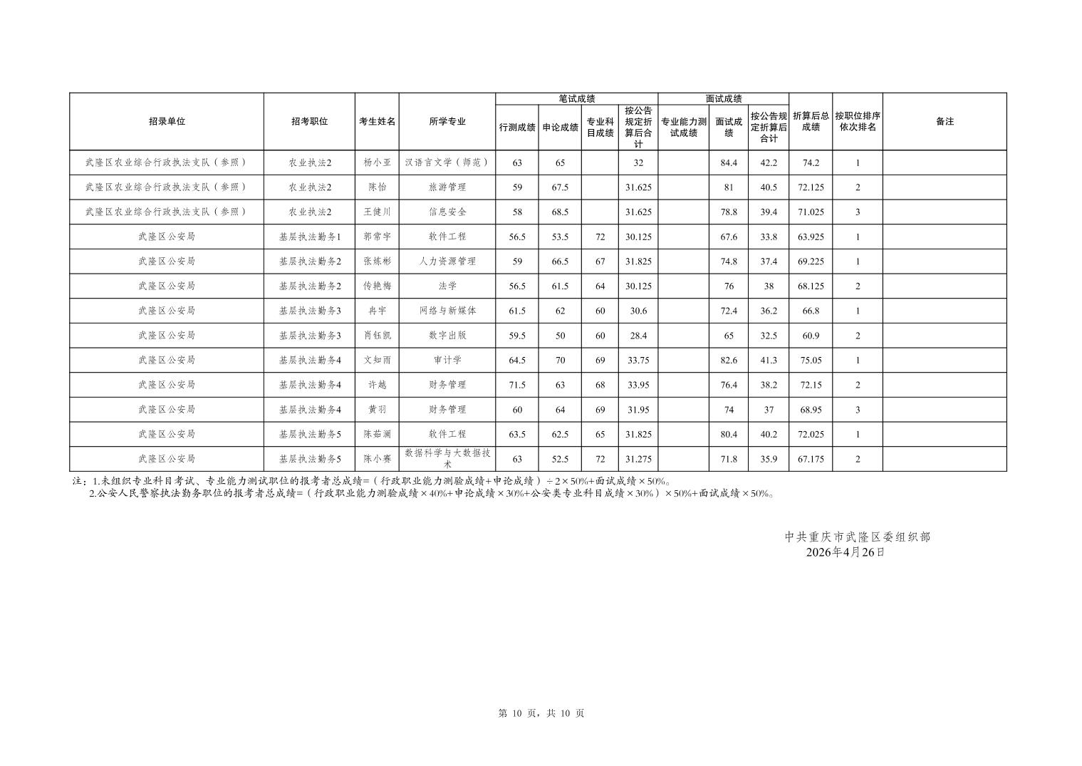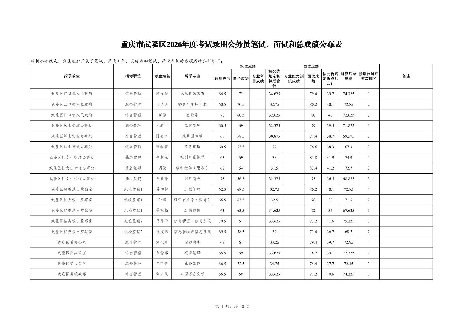 重庆市武隆区2026年度考试录用公务员笔试、面试和总成绩公布表