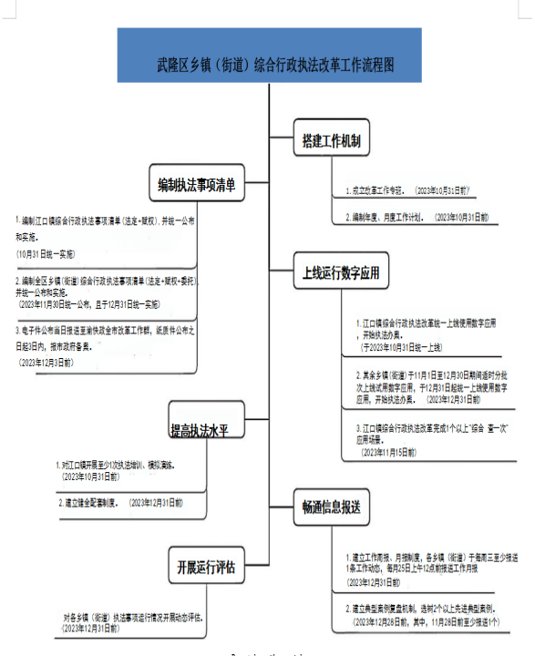 (四)分步推进实施。2023年11月30日前形成《重庆市武隆区乡镇(街道)法定行政执法事项清单(2023年)》《重庆市武隆区赋予乡镇(街道)部分区级行政执法事项清单(2023年)》《重庆市武隆区区级部门可依法委托乡镇(街道)行使执法权事项清单(2023年)》,于11月30日前向社会公布并报市政府备案,区级相关部门与各乡镇(街道)应于12月20日前完成赋权事项移交工作,各乡镇(街道)同步试运行“执法+监督”一体化数字集成应用,12月31日起各乡镇(街道)统一上线使用“执法+监督”一体化数字集成应用,开始执法办案,全区所有乡镇(街道)综合行政执法改革工作全面展开。