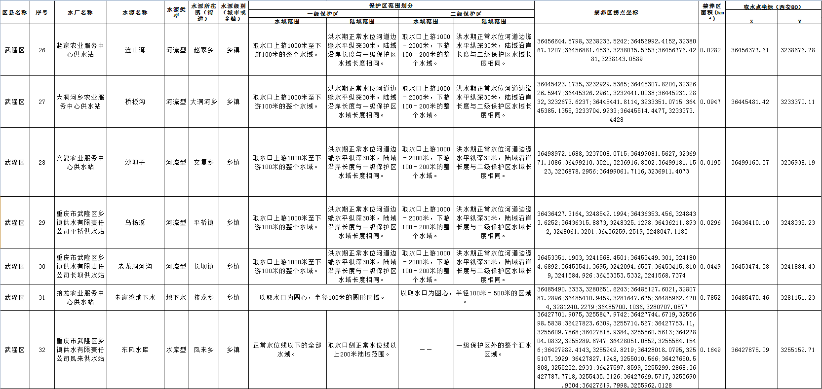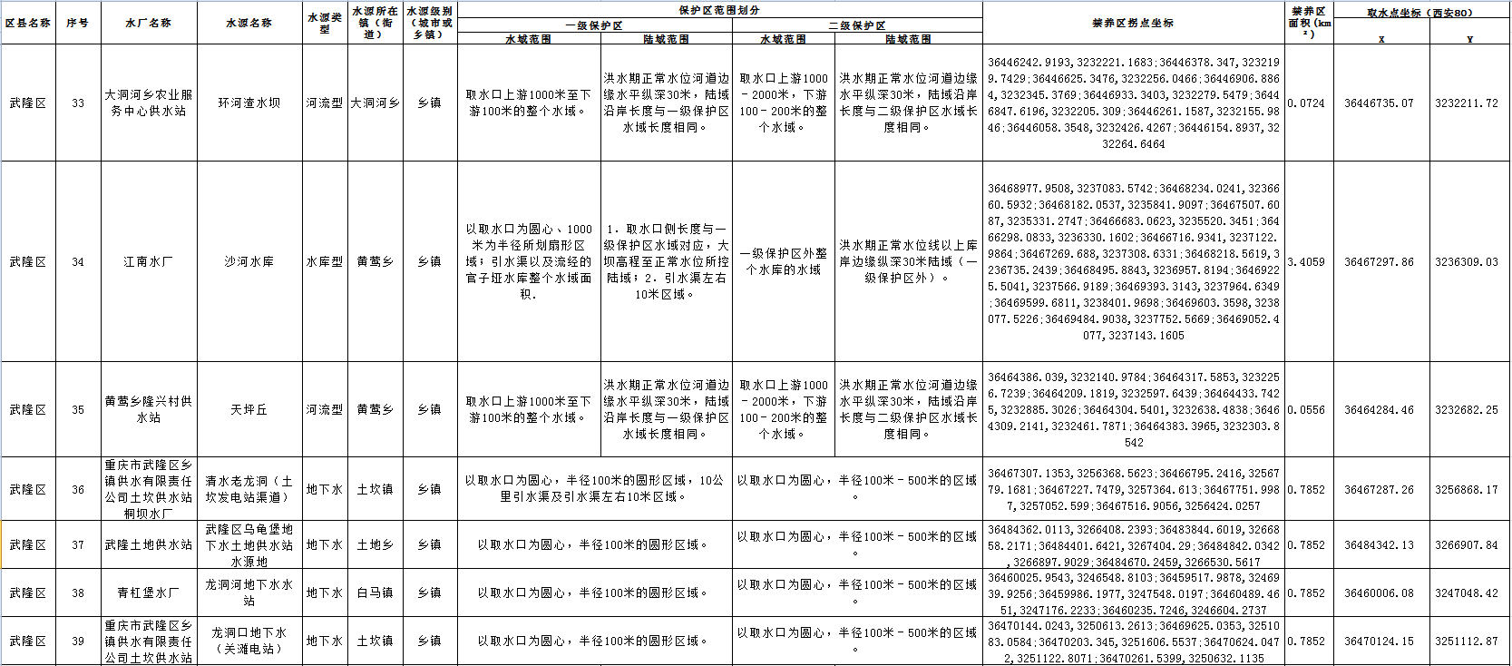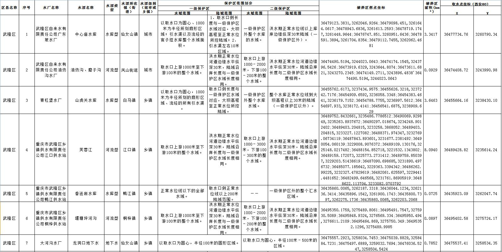武隆区饮用水水源地基本情况。武隆区集中式饮用水水源地共49个,按水源类型划分,包括河流型15个,水库型14个,地下水型20个。武隆区饮用水水源一级保护区和二级保护区共划定35.5682平方公里。武隆区饮用水源具体情况见下表3-1。