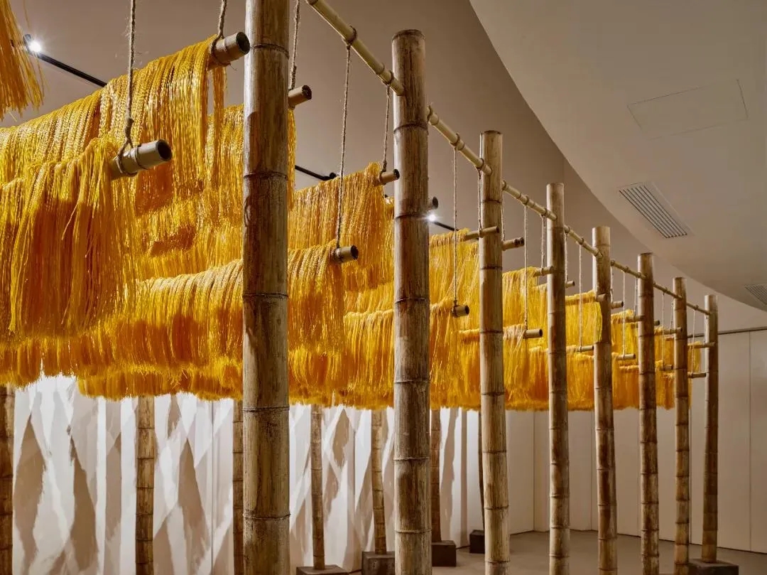 在懒坝美术馆中,他用南瓜、紫薯扩展了色彩的可能性,并在长度、宽度、韧度等多个方面进行了试验,形成了“苕之屋”。走进整个空间,空气中弥漫着苕粉的香味。