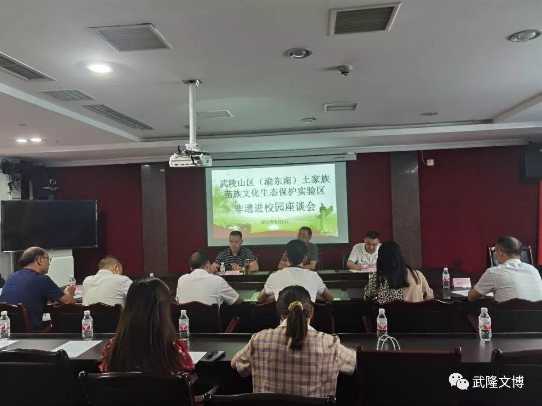 为扎实推进武陵山区(渝东南)土家族苗族文化生态保护实验区建设,培育非物质文化遗产的有效载体,助推学校特色文化建设,8月5日,区文化旅游委在机关五楼会议室组织召开了武陵山区(渝东南)土家族苗族文化生态保护实验区非遗进校园座谈会。区教委、区文化旅游委分管领导,区文化遗产保护管理所、石桥小学、黄莺小学、文复小学、后坪小学、浩口小学、龙洞小学等相关负责人和非遗传承人共计10余人参加会议,区文化旅游委党组成员、副主任任永生主持会议。